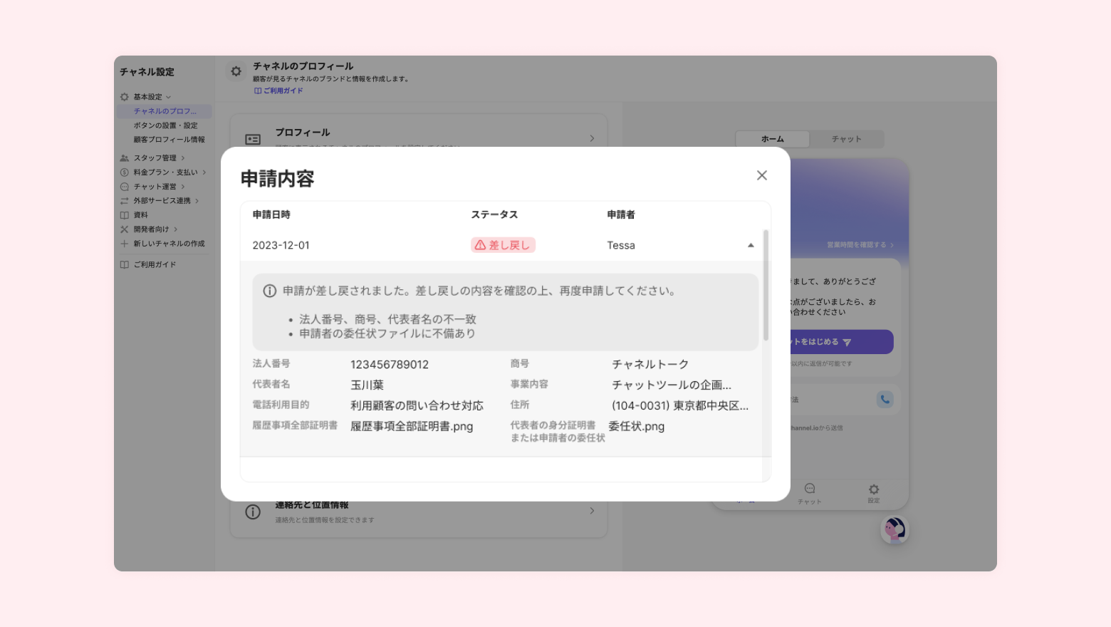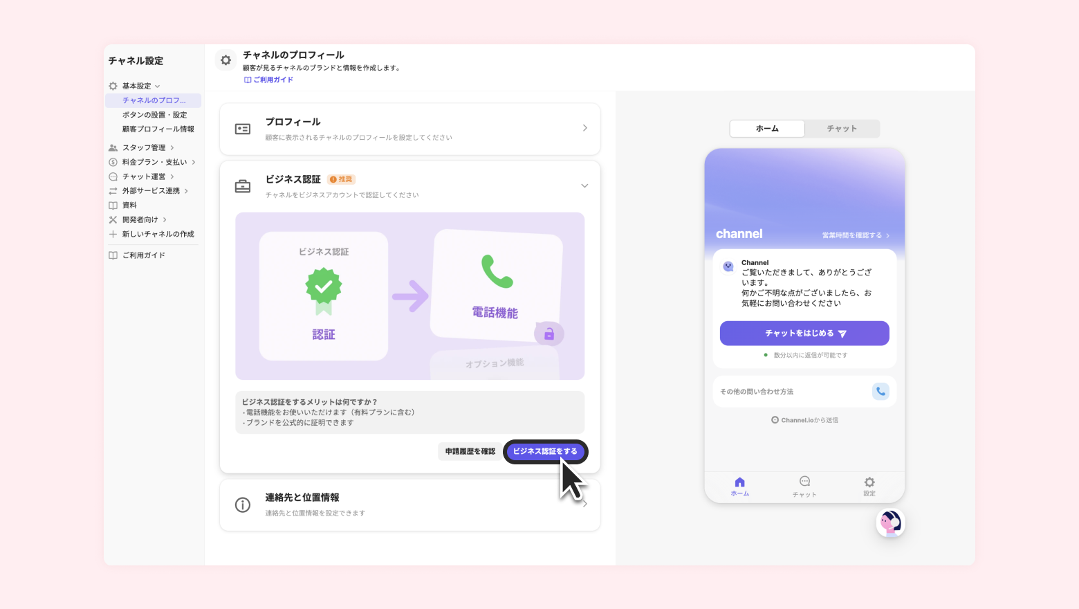 事業情報を申請することで運営中のチャネルをビジネスチャネルとして認証できます。 電話機能など一部のサービスは、ビジネス認証が完了したチャネルに限り利用可能です。