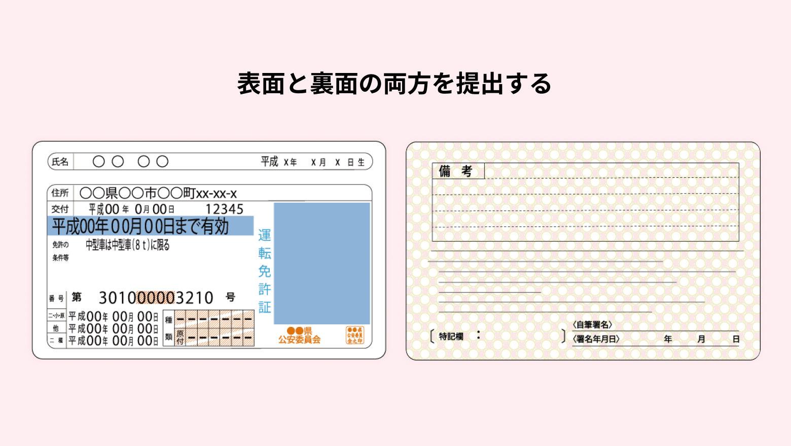 運転免許証などの書類を提出する場合は表面と裏面の両方が必要です。