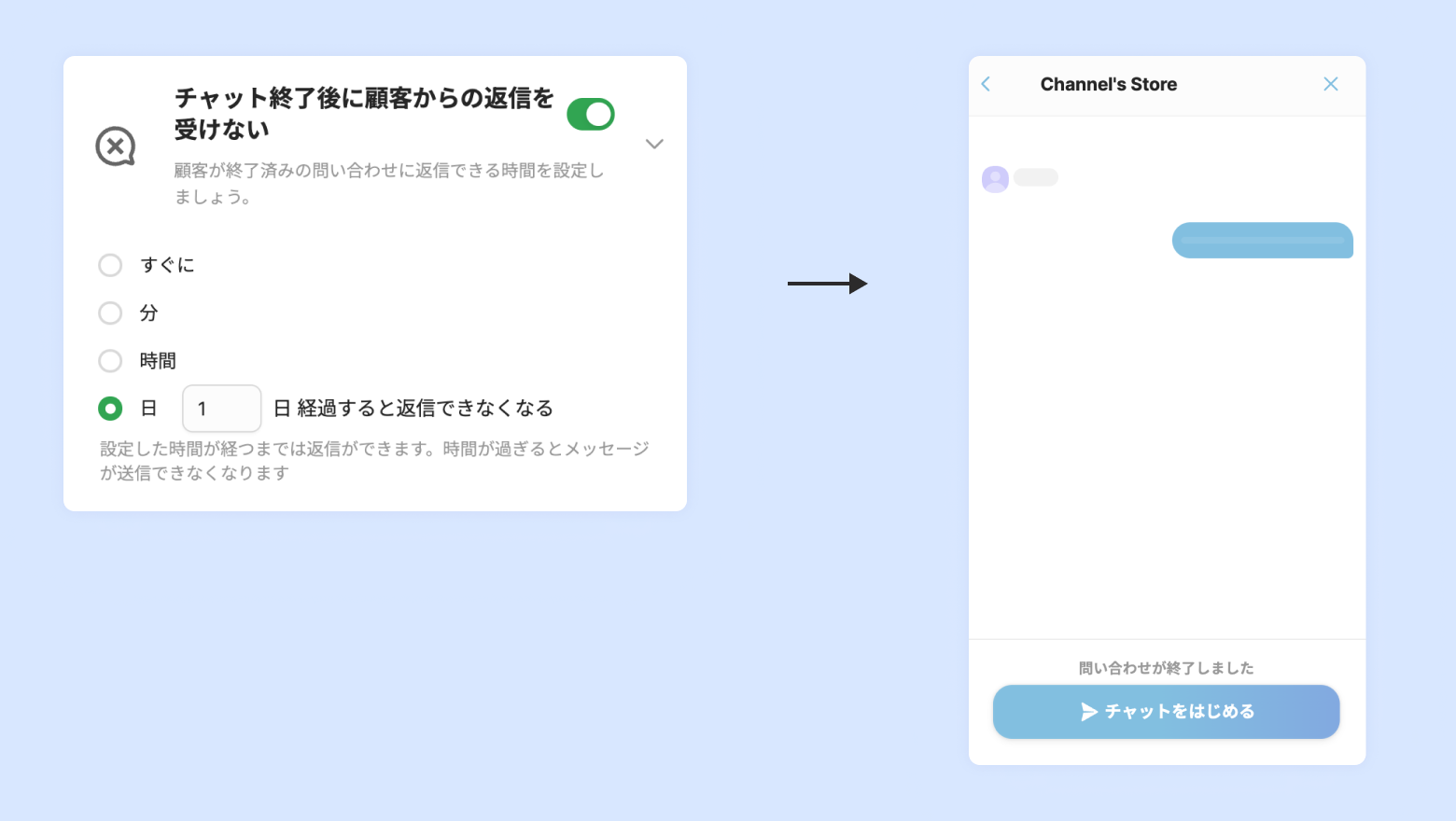 [チャネル設定] - [問い合わせ] - [運営] 内の [営業時間] - [チャット終了後に顧客からの返信を受けない] で設定できます。