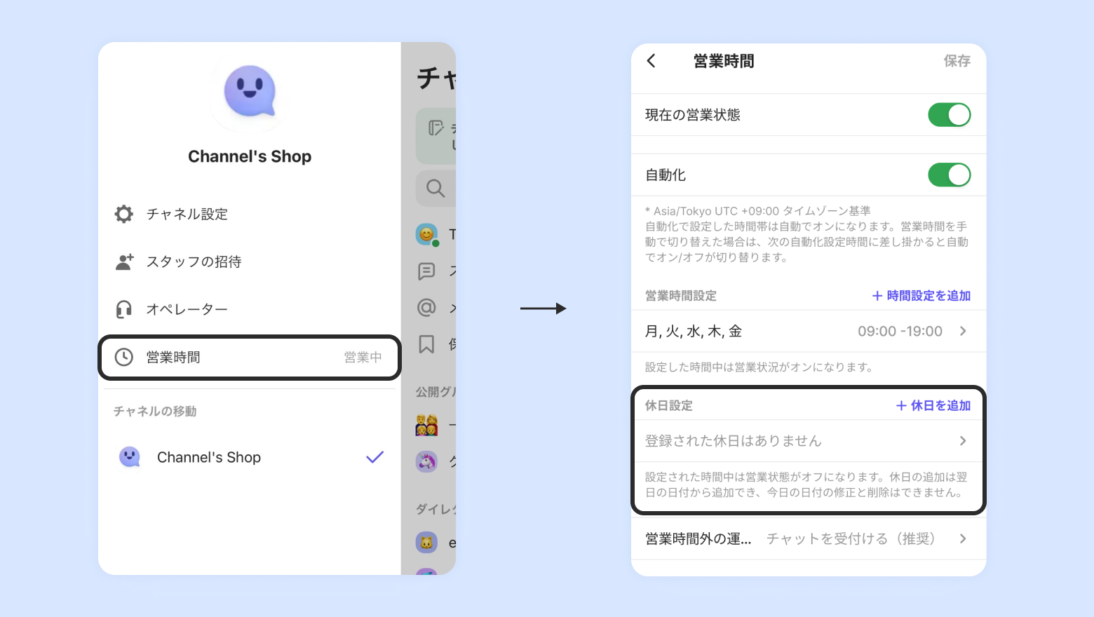 [自動化] で営業時間と営業時間外を自動で切り替えることができます。