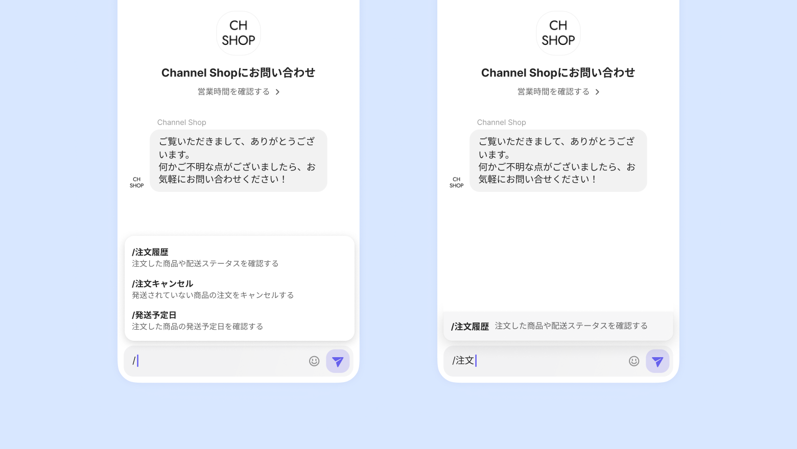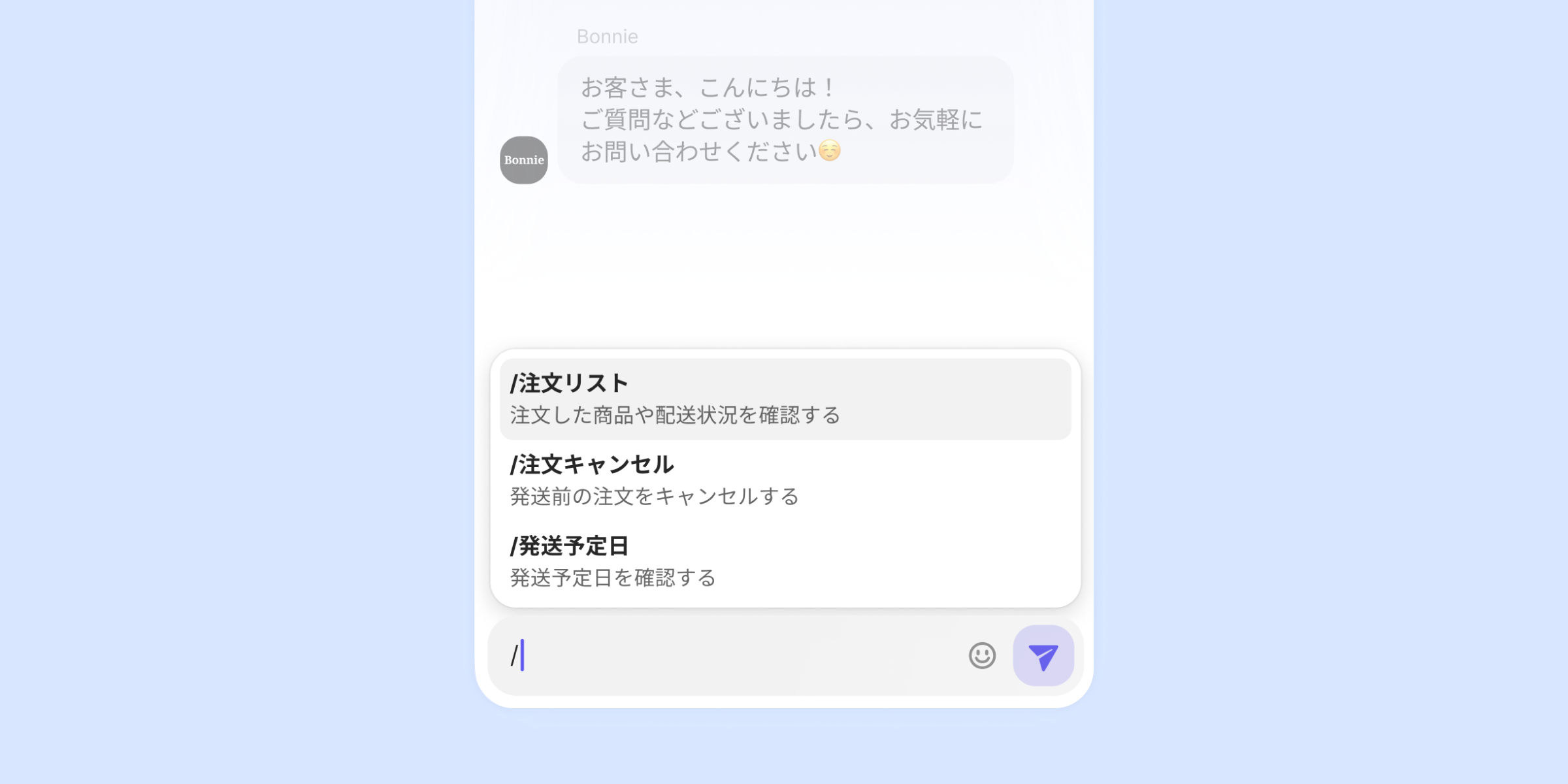 顧客が入力窓で直接 /(スラッシュ)を入力した時に表示されるリストから選択したり、直接命令語を入力して利用できます。