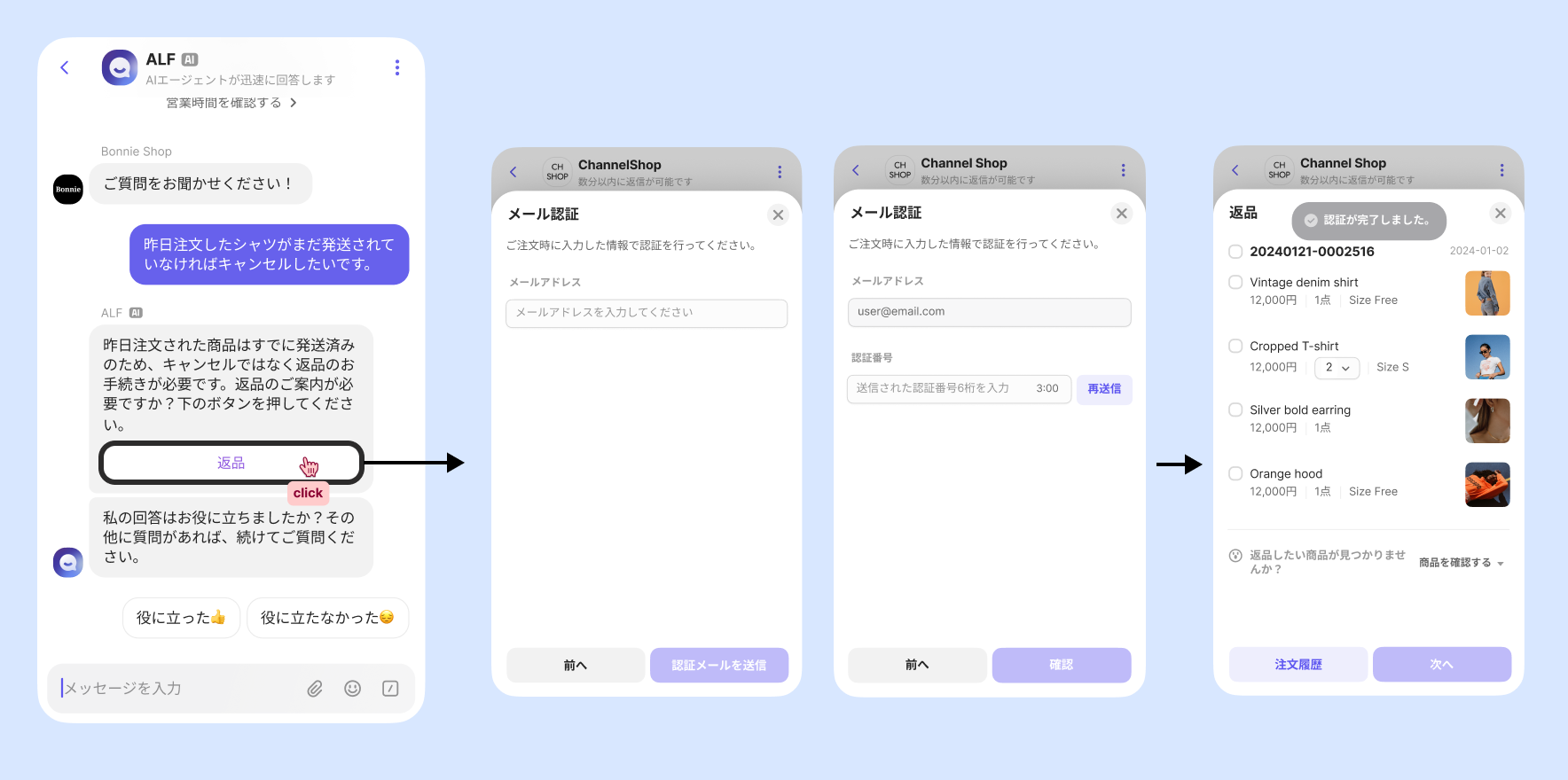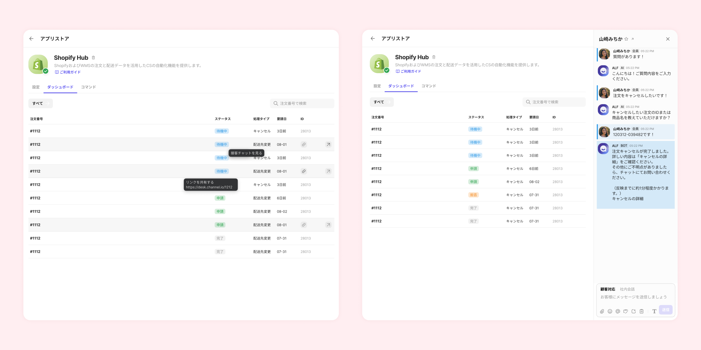 連携された注文内容を基盤に注文履歴の照会、発送予定日の確認、注文キャンセル、配送先変更などのコマンドアクションを実行することができます。