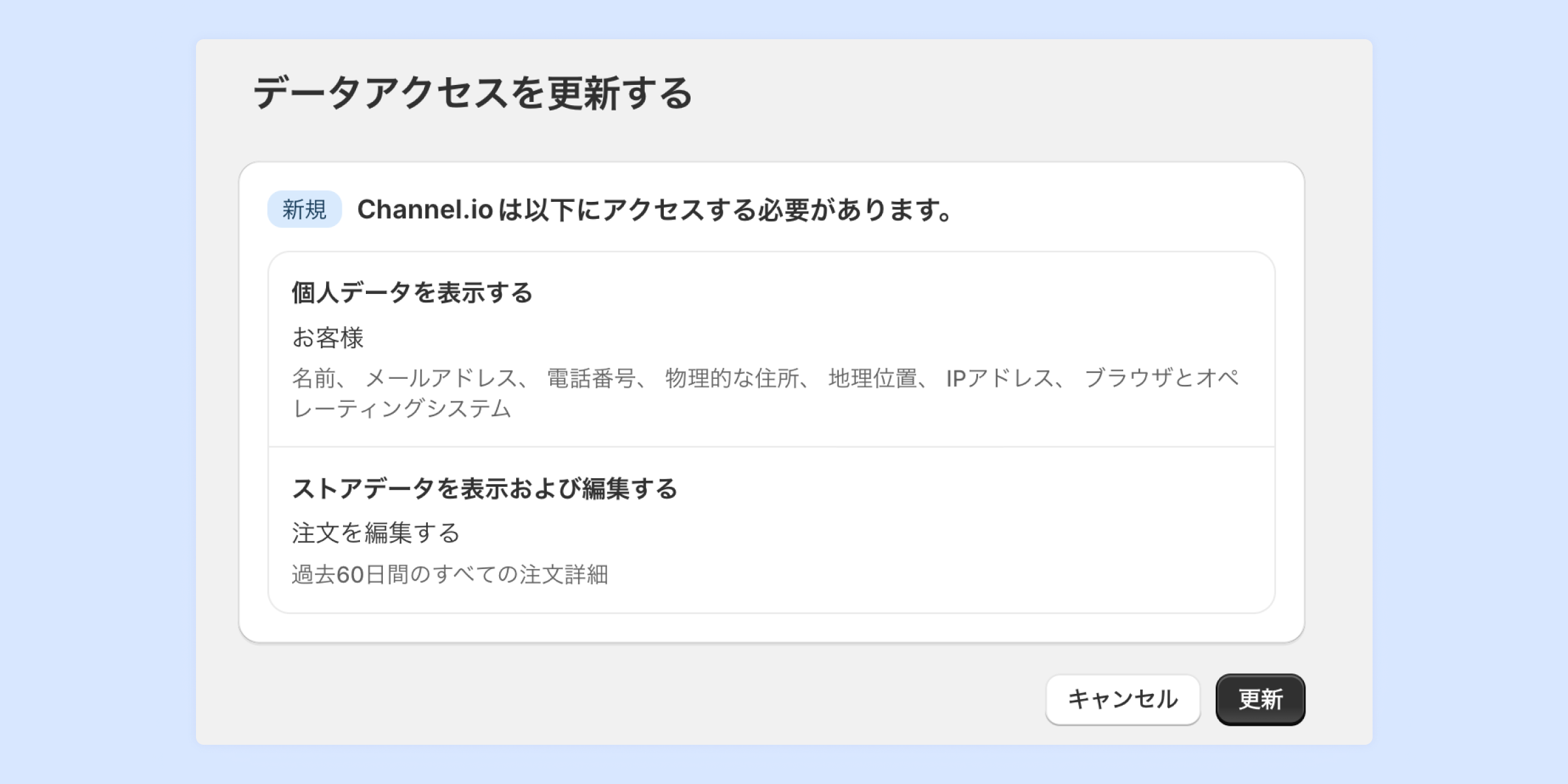 Shopify Hubをインストール後、コマンドを通して注文キャンセルをするためにShopify管理画面にてチャネルトークアプリの権限を変更する必要があります。