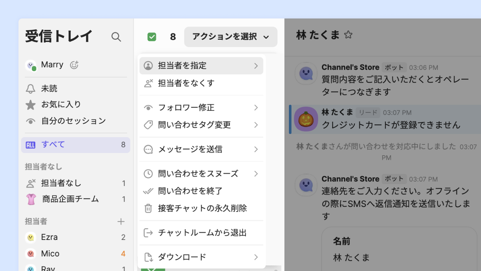 • 問い合わせを終了:問い合わせを終了済みに変更します。