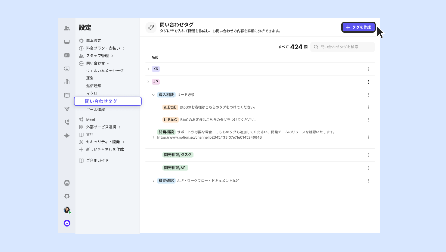 方法:[チャネル設定] - [問い合わせ] - [問い合わせタグ] でタグの作成と管理