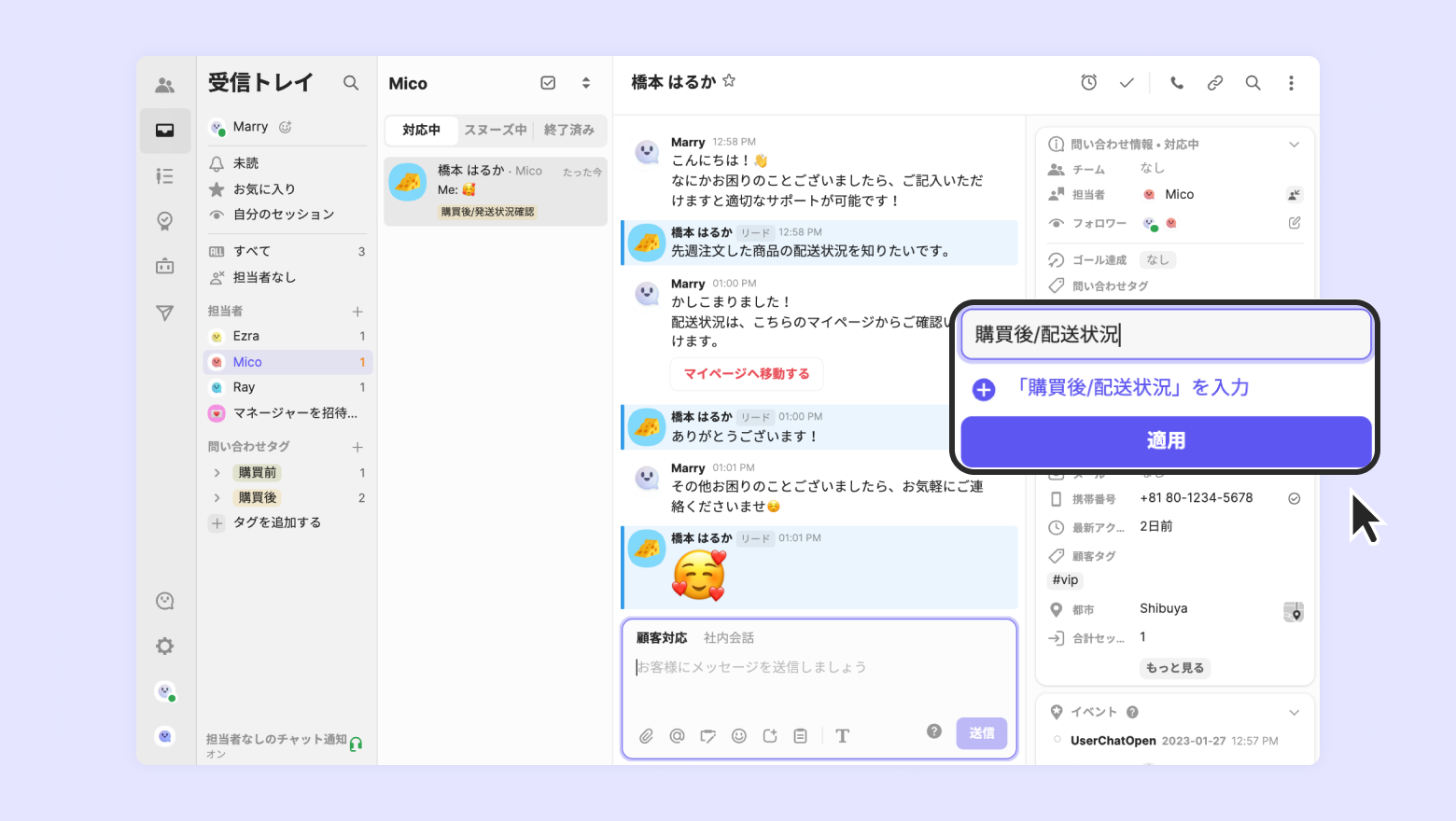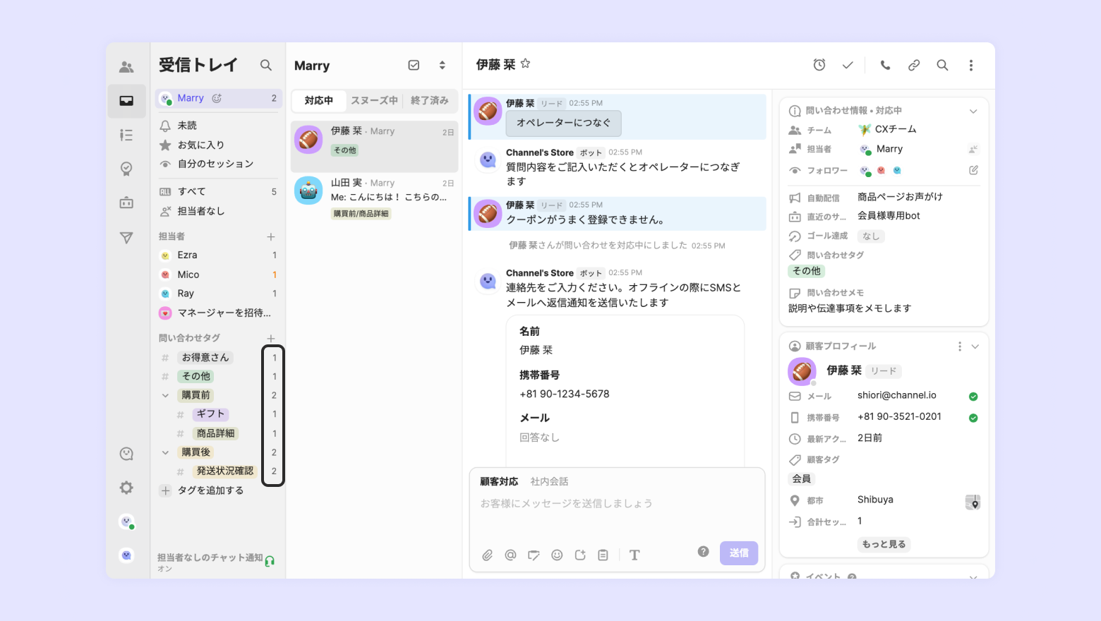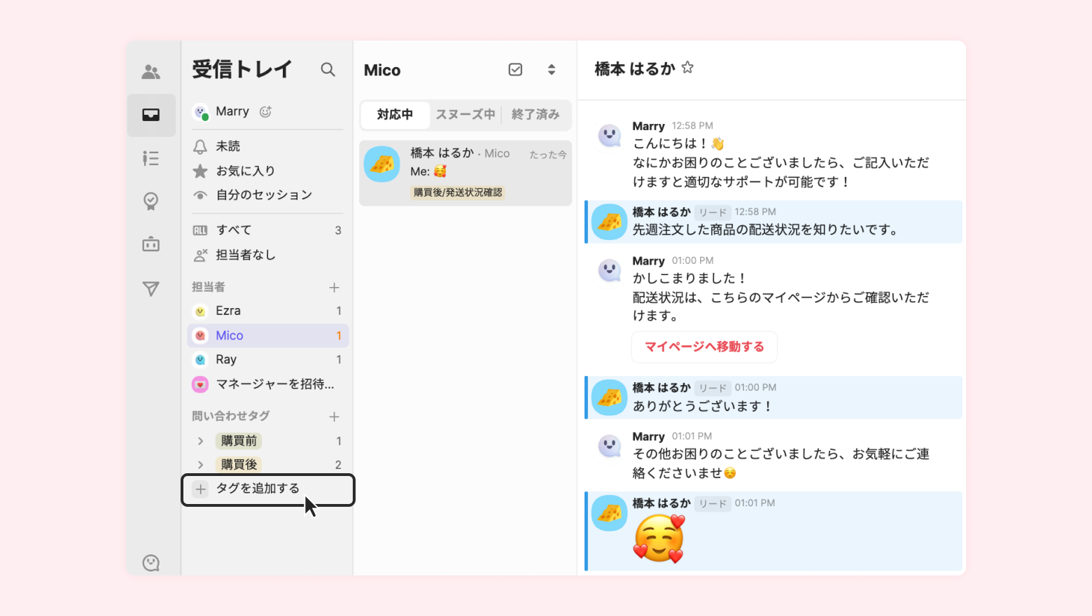 受信トレイ左側のメニューと接客チャットリストで貼り付けられた問い合わせタグを確認できます。