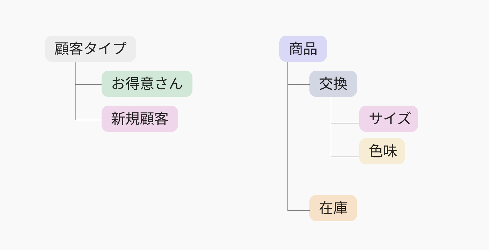 例)商品の返品に関する問い合わせを分類する場合は、"商品の問い合わせ/返品" と分類した後さらに、サイズ関連の苦情、カラー関連の苦情、と分類し、 "商品の問い合わせ/返品/サイズ"、"商品の問い合わせ/返品/カラー" のように分類できます。