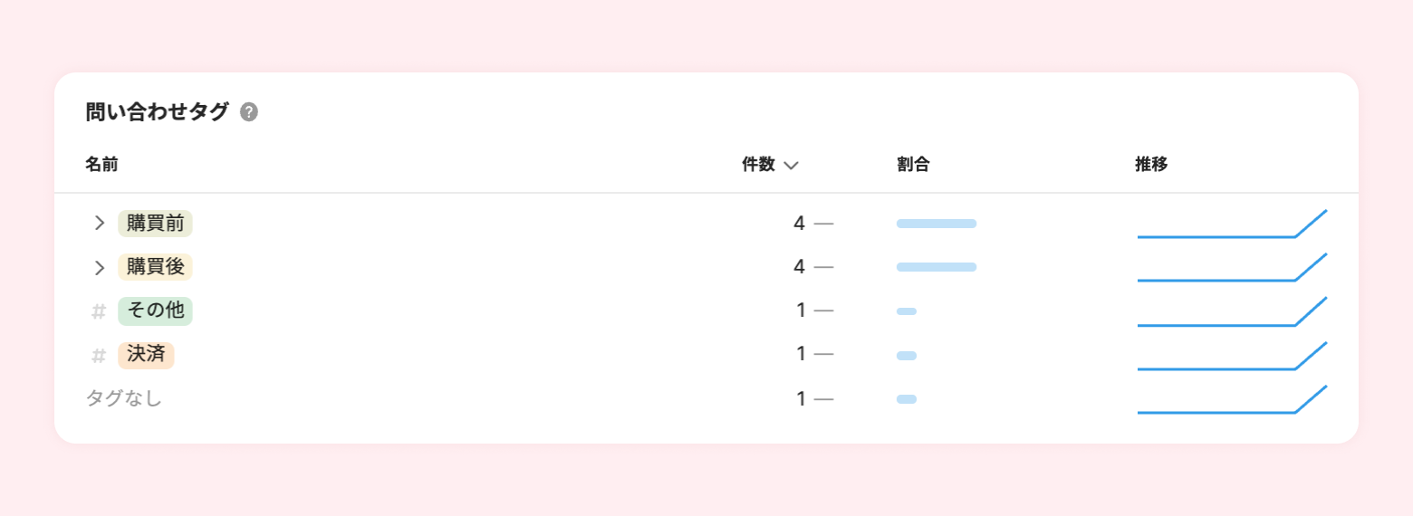 問い合わせ統計で、該当の期間中にどのようなタグの問い合わせが多く入ってくるのか、全体の問い合わせの中でどのような割合を占めているのか、期間別に流入のトレンドはどのような変化があったのかを確認することで、ビジネスの問題点を分析することができます。