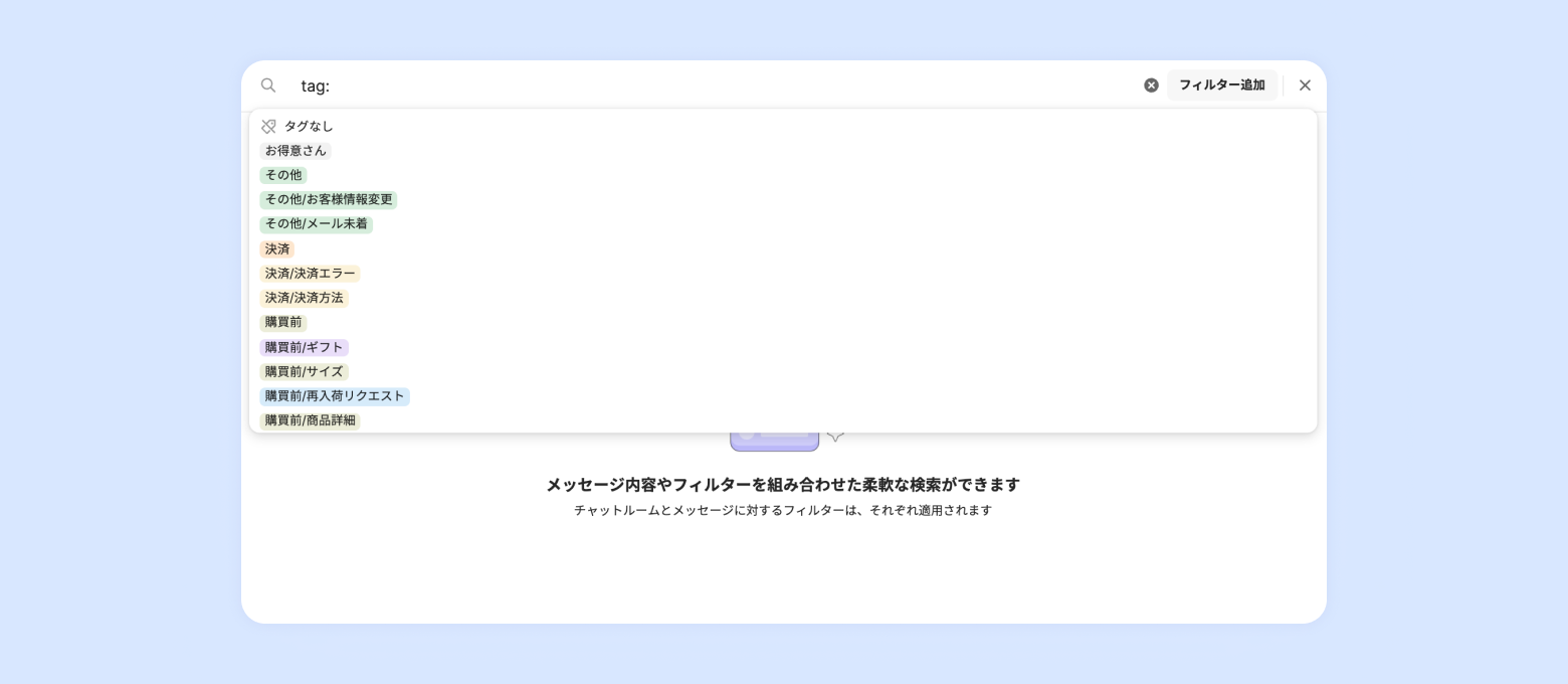 例)"tag:決済" と "tag:配送" を検索すると、 決済というタグが付いている問い合わせと、配送と付いている問い合わせのどちらも表示されます。(→問い合わせの検索方法を見る)