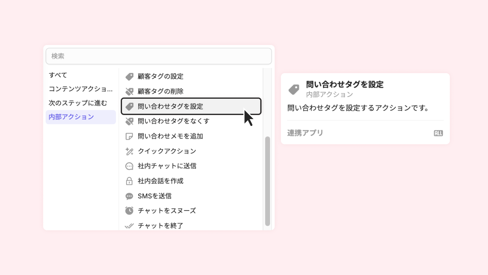 ワークフローのアクション設定で、特定のステップに入った顧客の問い合わせに自動的に問い合わせタグを設定または削除することができます。