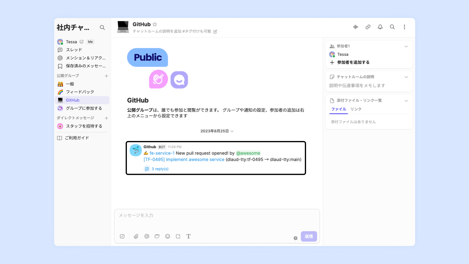 GitHubで発生するPRとIssueイベントをリアルタイムでチャネルトークの社内チャットに送信することができます。開発者はコードのレビューおよび問題解決に関する通知を受けて効率的に作業することができます。