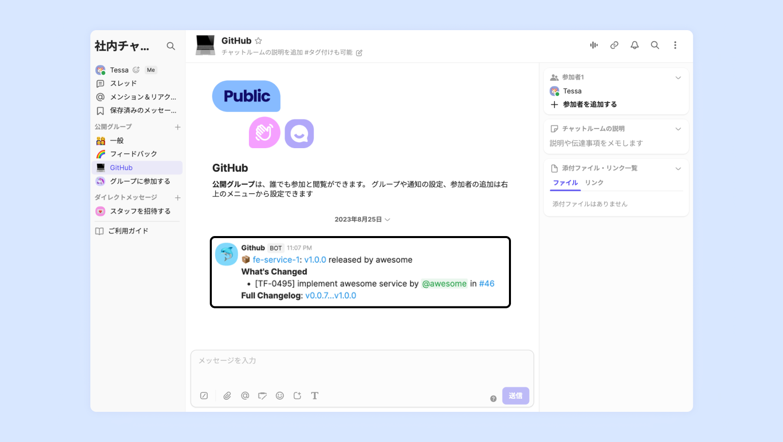 GitHubで発生するReleaseイベントをリアルタイムでチャネルトークの社内チャットに送信することができます。開発者は新しいバージョンのソフトウェアをリリースおよびアップデートに関する通知を受けてプロジェクトのステータスを把握して対応することができます。