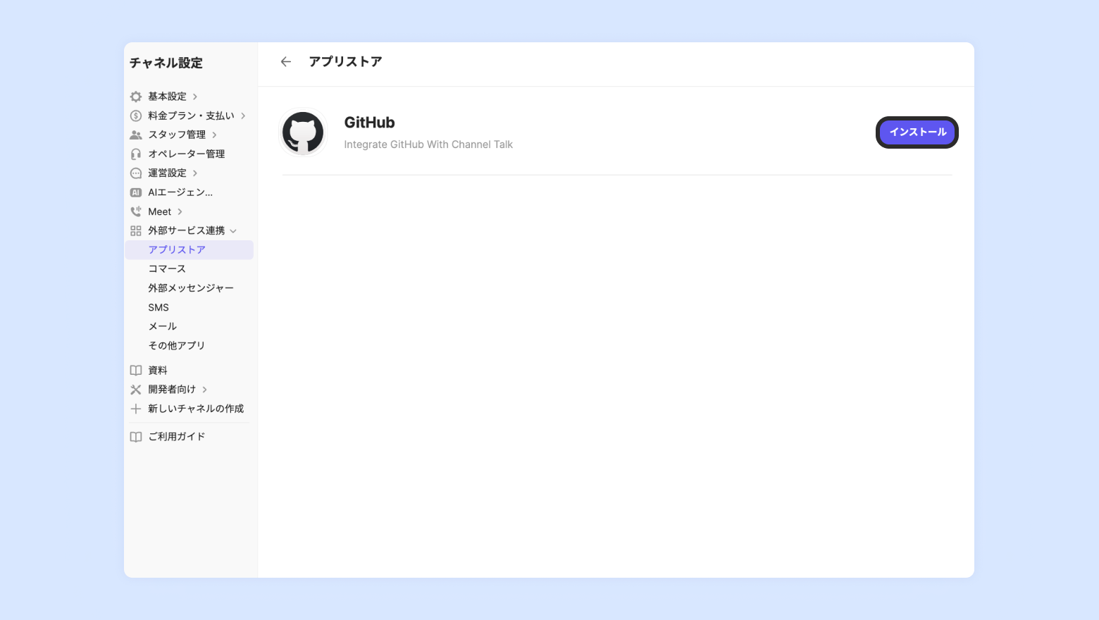 [チャネル設定] - [外部サービス連携] - [アプリストア] でGitHubアプリをインストールします。
