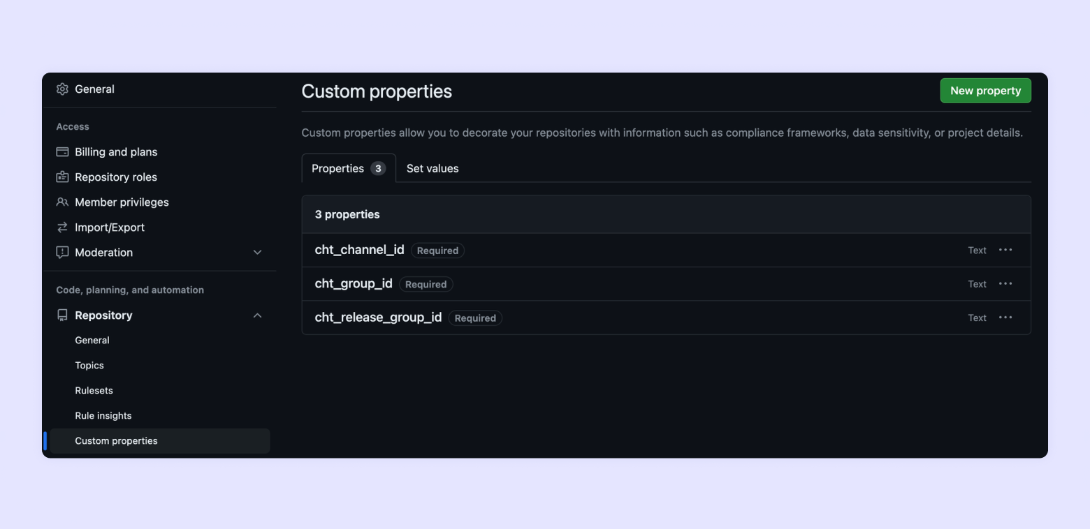 GitHubイベントをチャネルと社内チャットに連携するために、下記の3つのcustom propertyの設定が必要です。