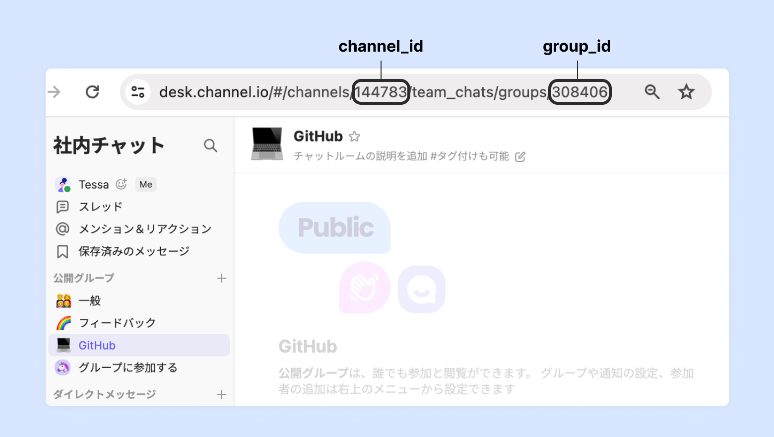 チャネルID、社内チャットIDの値はブラウザでチャネルトークを開いた際のURLで確認できます。