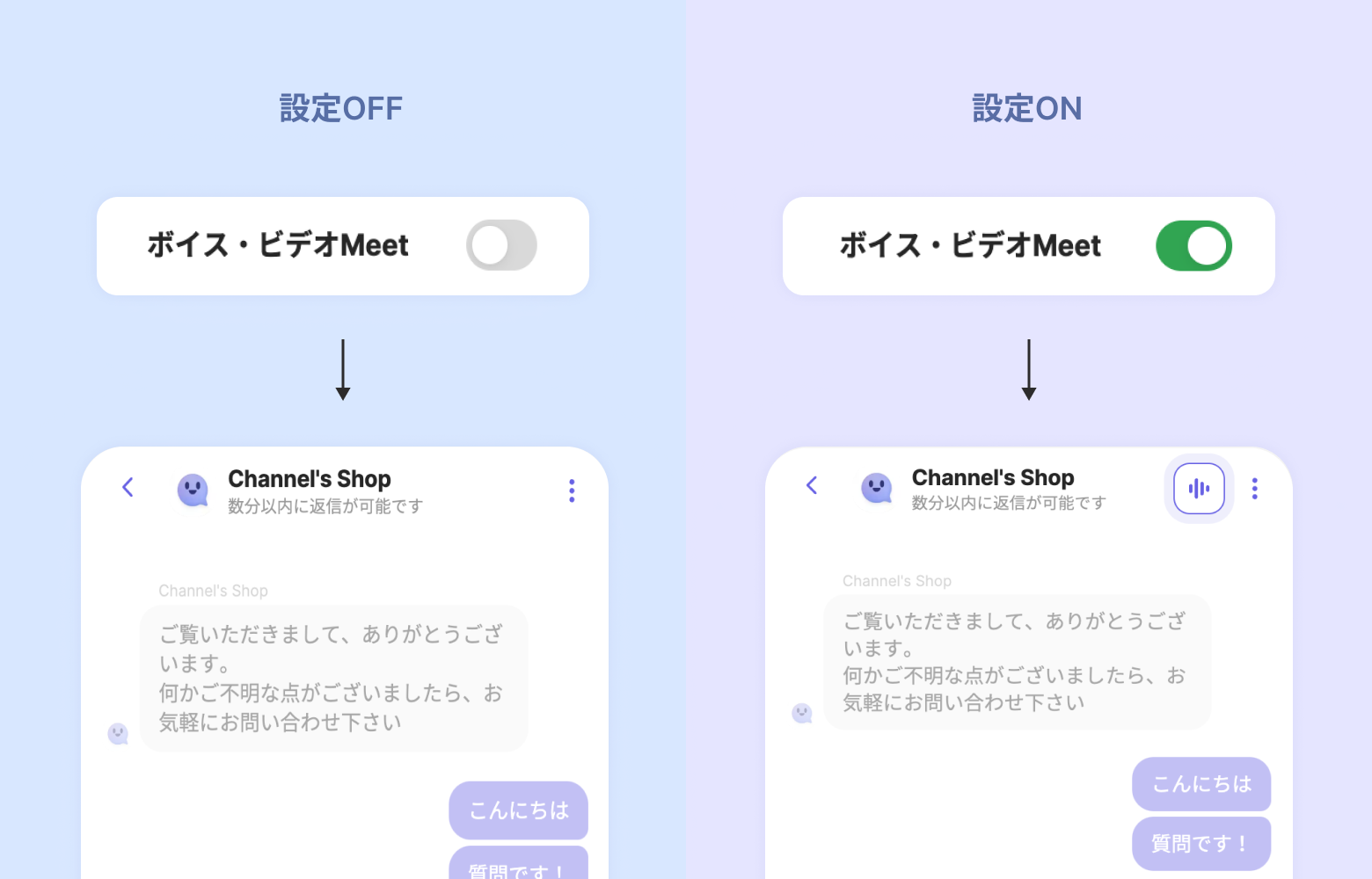 顧客からチームメンバーにボイスMeetを始められるように設定できます。設定をすると顧客のチャット画面でMeetを始めるためのボタンが表示されます。