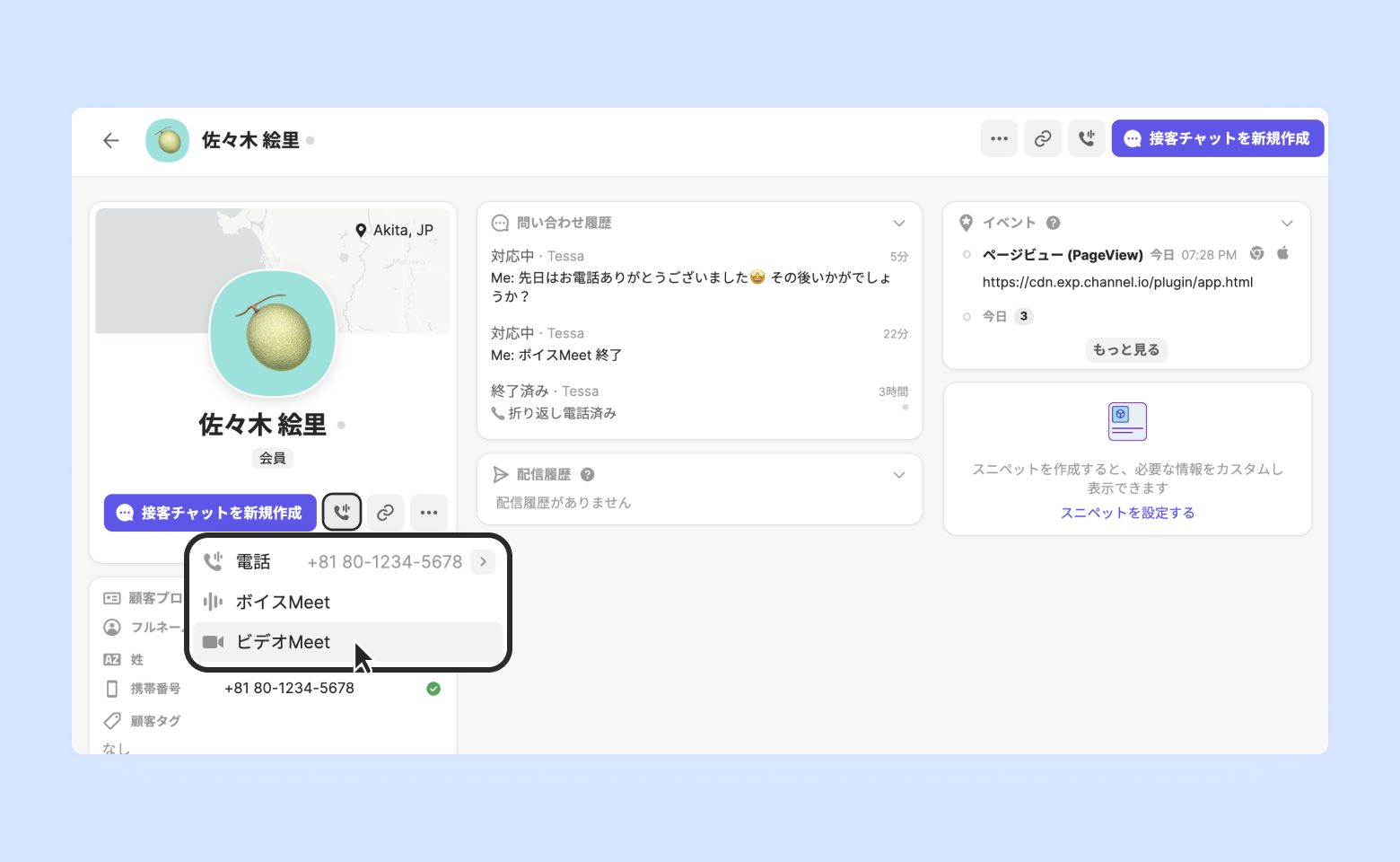 • 方法:[顧客プロフィール] - [Meet] - [ビデオMeet]