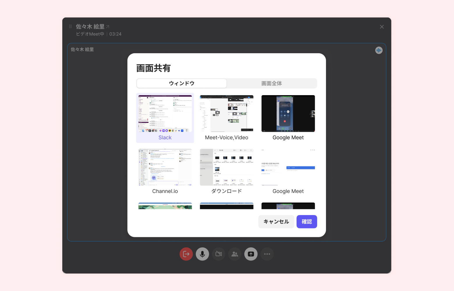 2. 画面共有:クリックすると、どの画面を共有するかを選択するウィンドウが表示され、自分の画面をMeet参加者に共有できます。