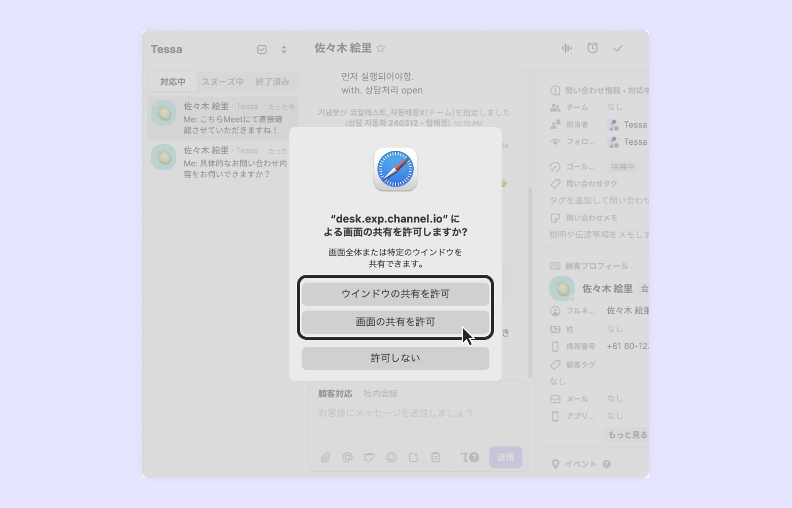Safariでは画面共有時に常に画面共有ポップアップが表示されます。このポップアップの許可をクリックして、画面共有を開始してください。
