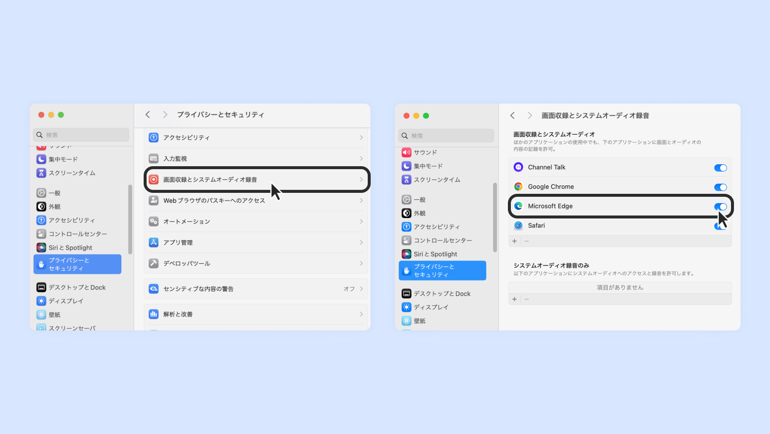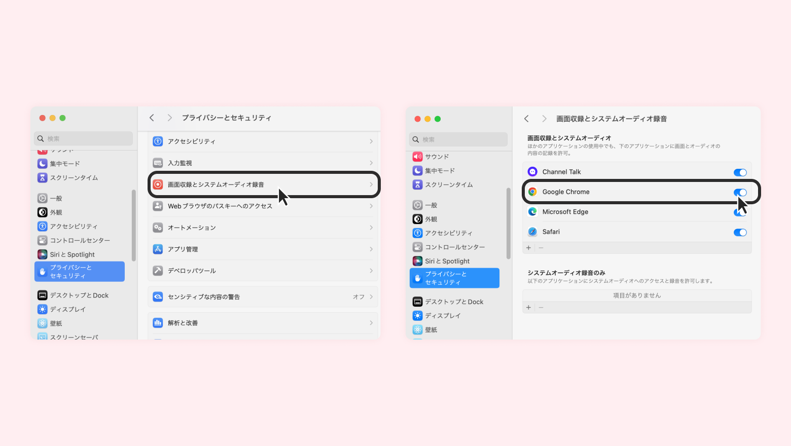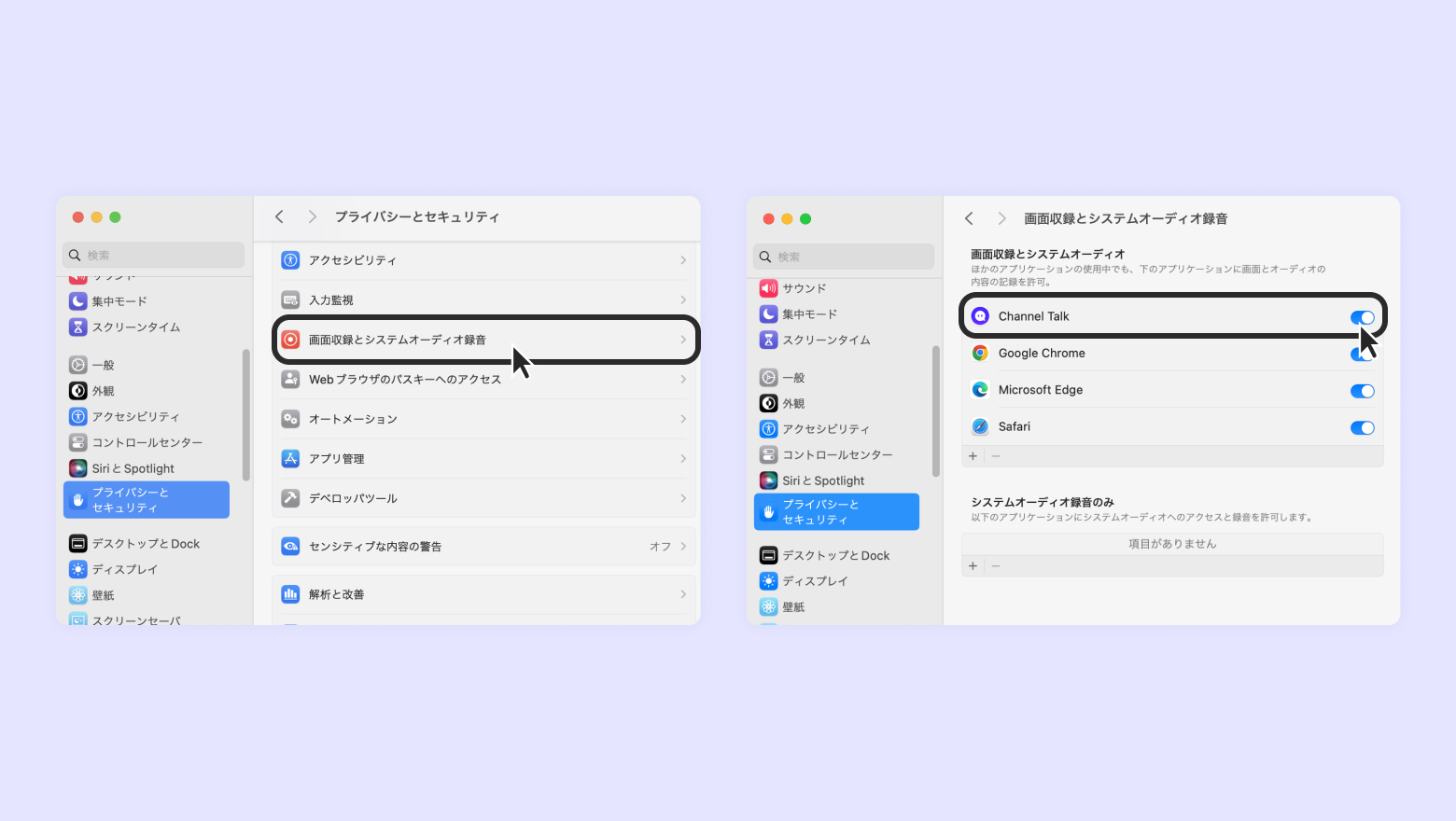 [システム環境設定] - [プライバシーとセキュリティ] - [画面収録とシステムオーディオ録音] でチャネルトークアプリの画面収録を許可してください。