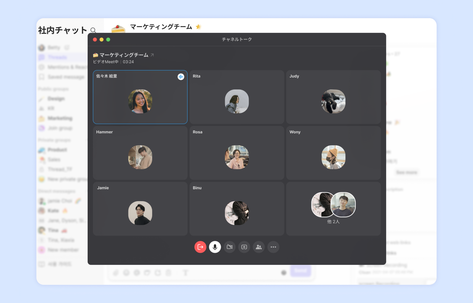 社内チャットのチャットルームやDMでもビデオMeetを利用できます。社内チャットの上部にある [Meet] - [ボイスMeet] ボタンを押してチームメンバー同士の会議が可能です。