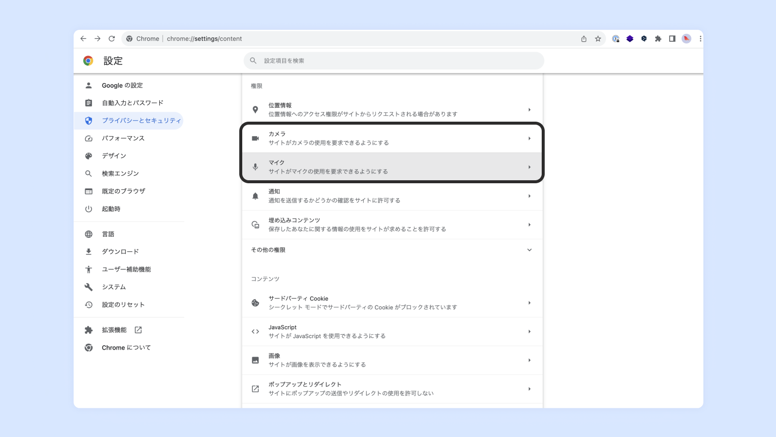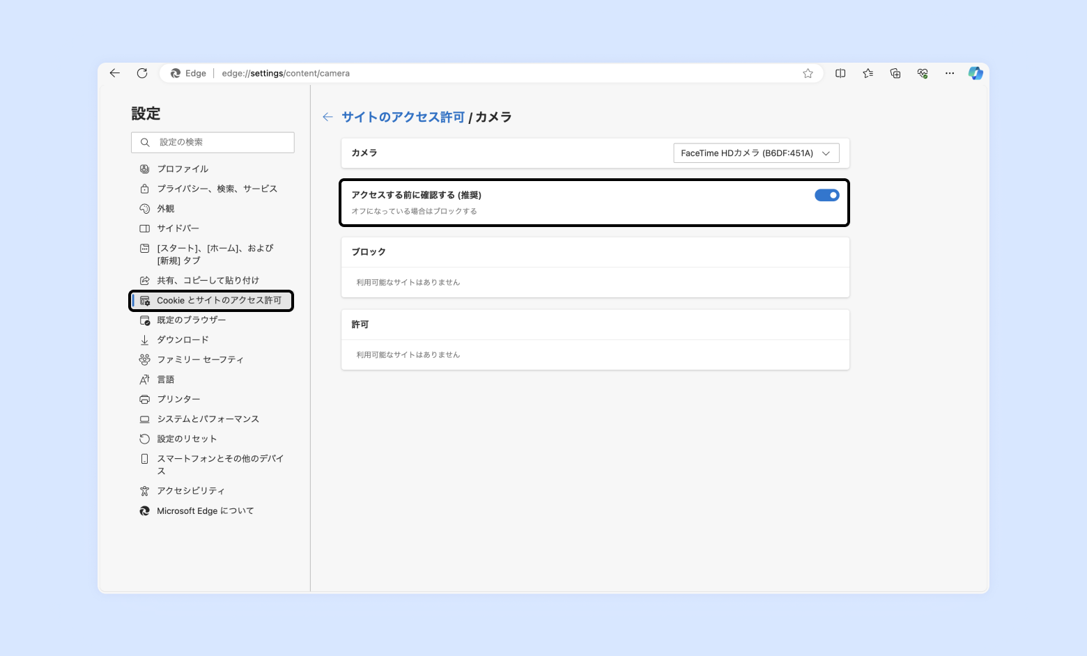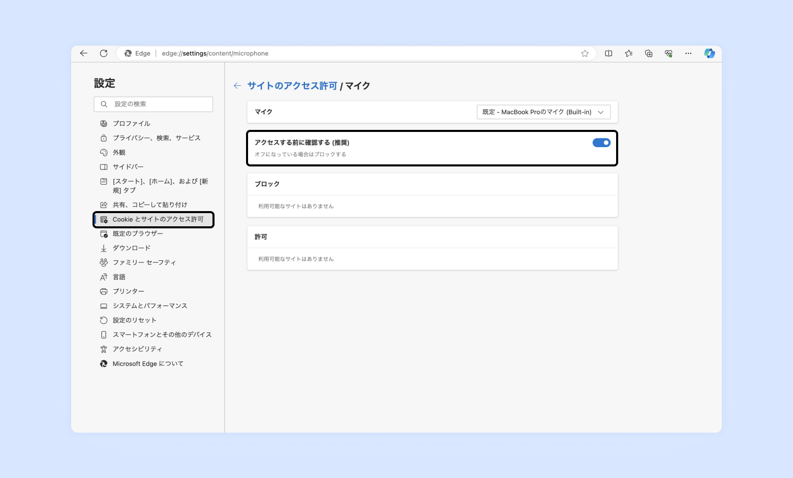 1. [Cookieとサイトのアクセス許可] - [マイク]、[カメラ] にそれぞれ接続し、[アクセス前に確認する(推奨)] をONにしてください。