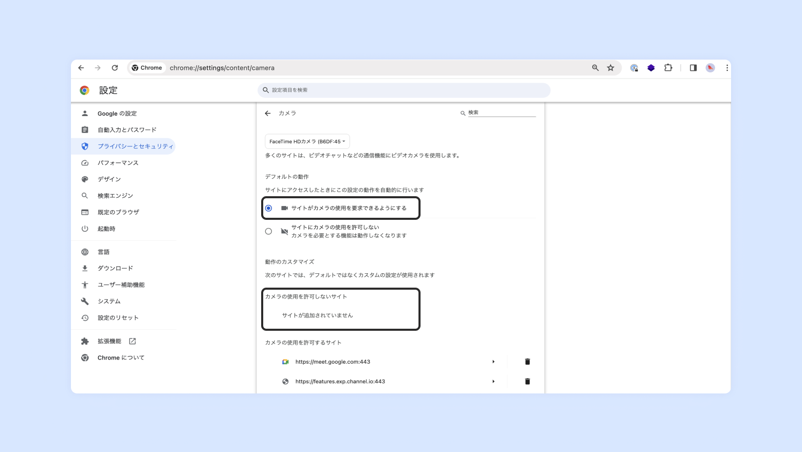 ビデオMeetをするにはマイクとカメラのアクセス権限を許可する必要があります。ご利用のデバイスやブラウザごとにアクセス権限の設定方法を確認してください。