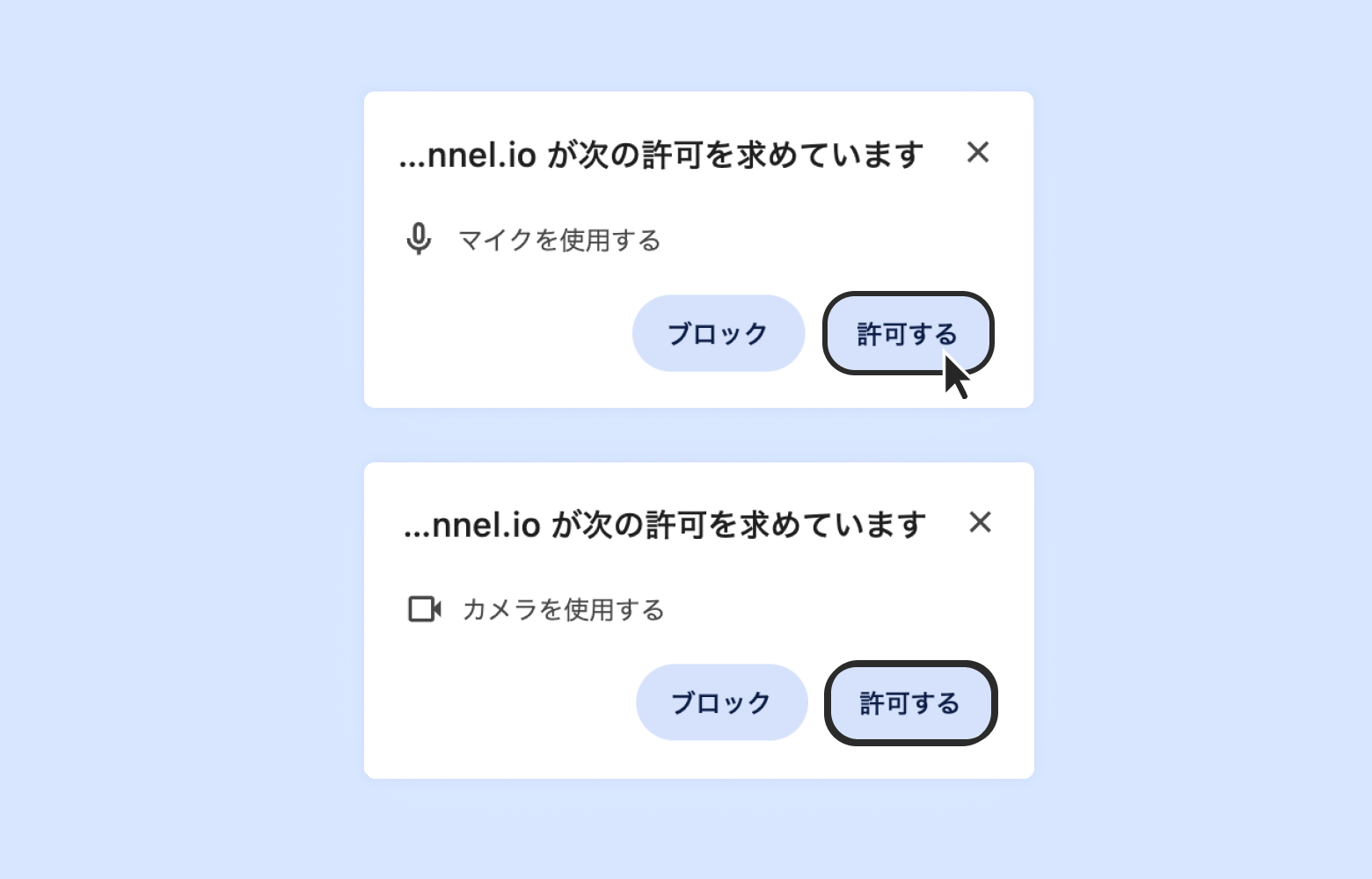 1. [マイク]、[カメラ] でそれぞれChannelの権限を許可してください。