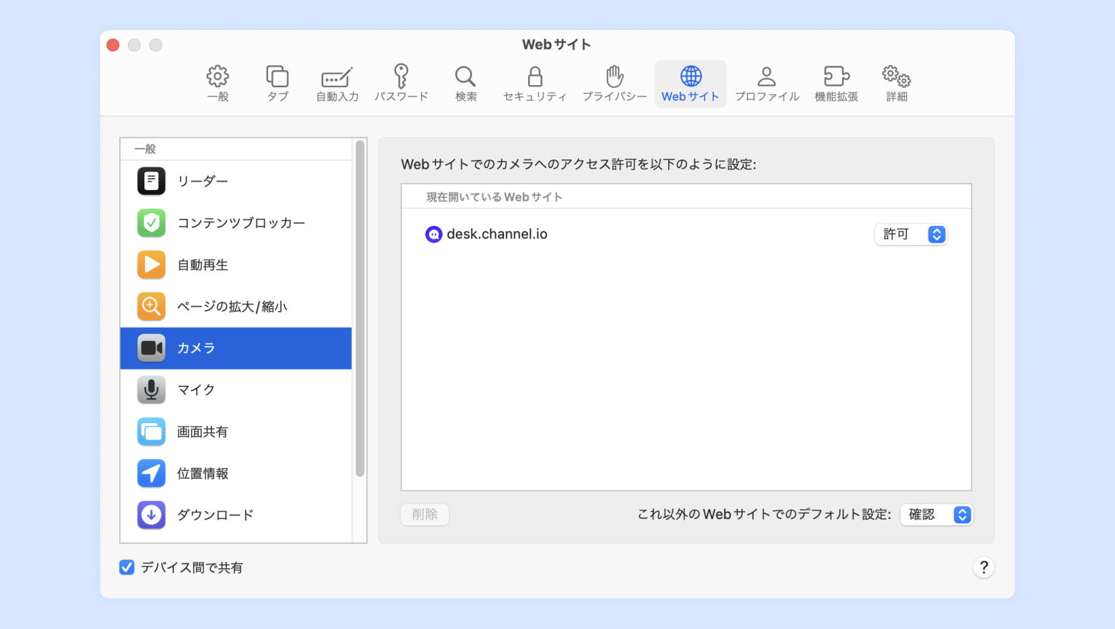 1. [Webサイト] - [マイク]、[カメラ] でそれぞれチャネルトークアドレス(channel.io)に対して権限を許可してください。