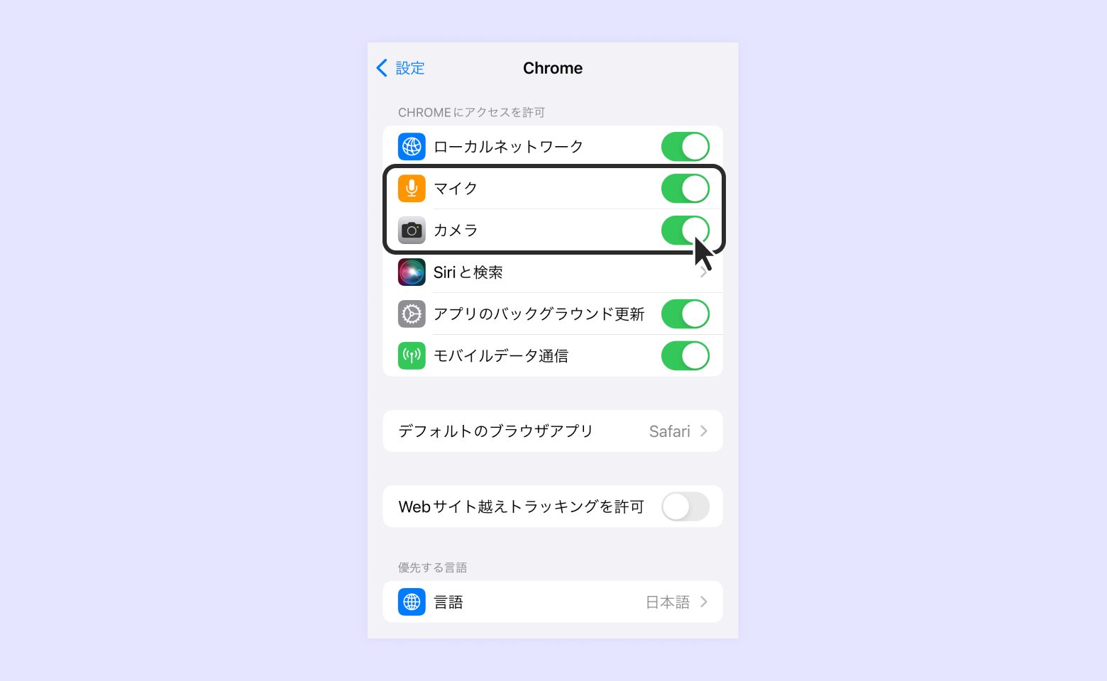• [設定] - [アプリ] - [使用するブラウザアプリ] - [権限] - [マイク]、[カメラ] を選択後、それぞれ権限を許可してください。