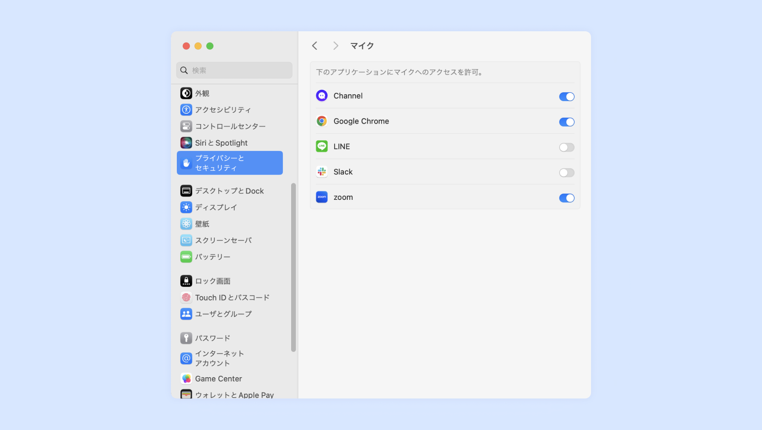 1. [システム環境設定] - [プライバシーとセキュリティー] - [マイク]、[カメラ] を選択します。