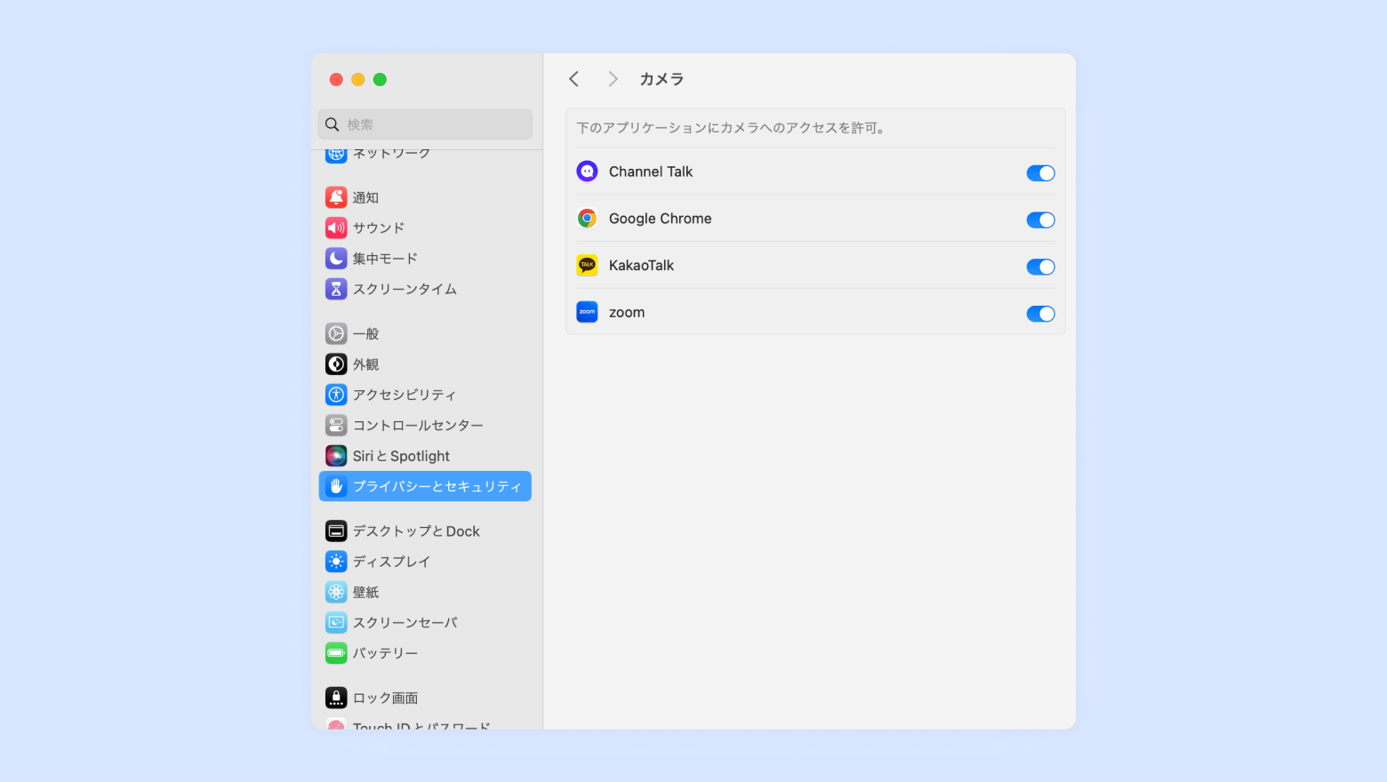 1. [システム環境設定] - [プライバシー] - [マイク]、[カメラ] でそれぞれアクセス許可と Channel.ioアプリでのマイクとカメラのアクセスを許可してください。