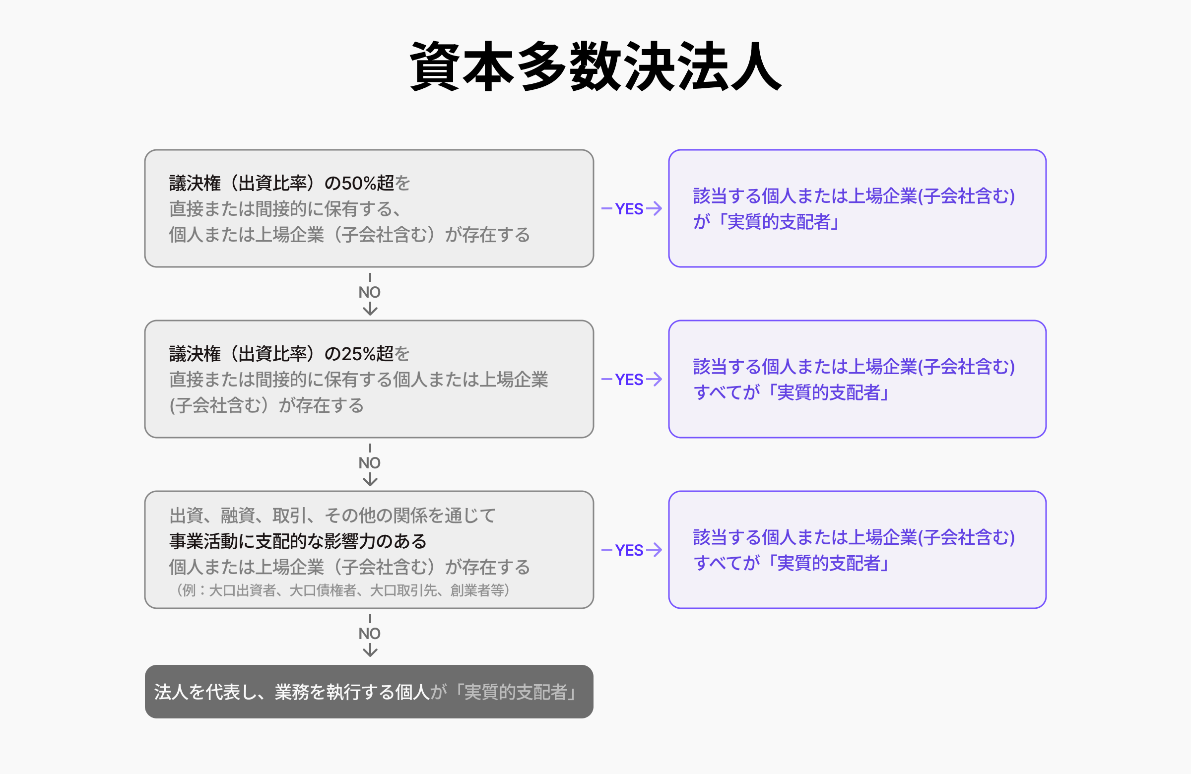 間接保有分を計算することから、実質的支配者は原則個人まで遡ります。