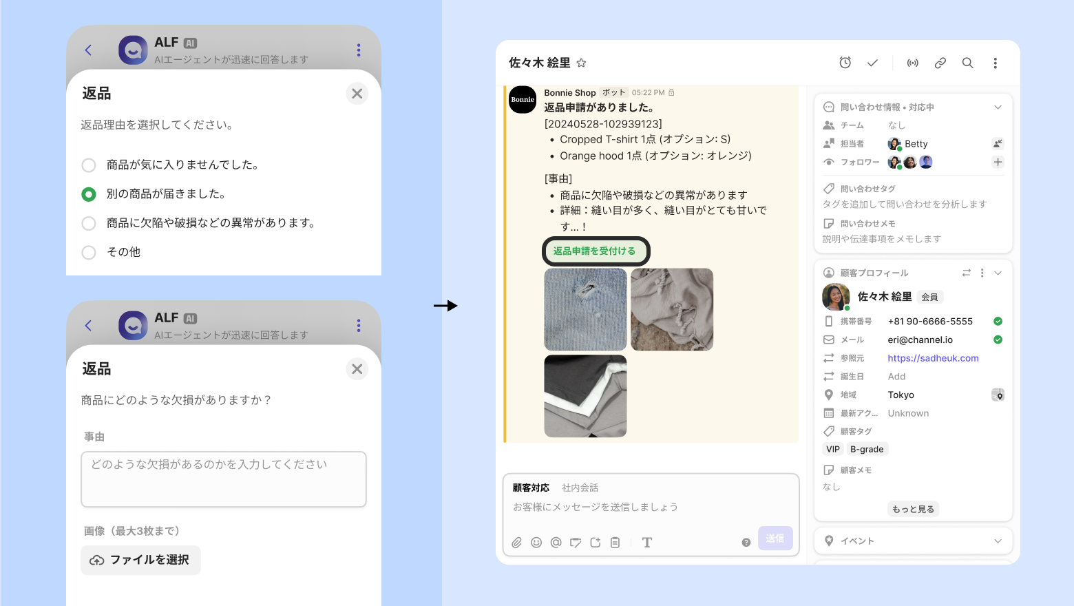 不良品および誤配送などのショップ側の都合により申請された返品/交換の場合、顧客が添付した写真を先に確認の上、返品/交換(ショップ側で送料負担)の承認可否をすることができます。