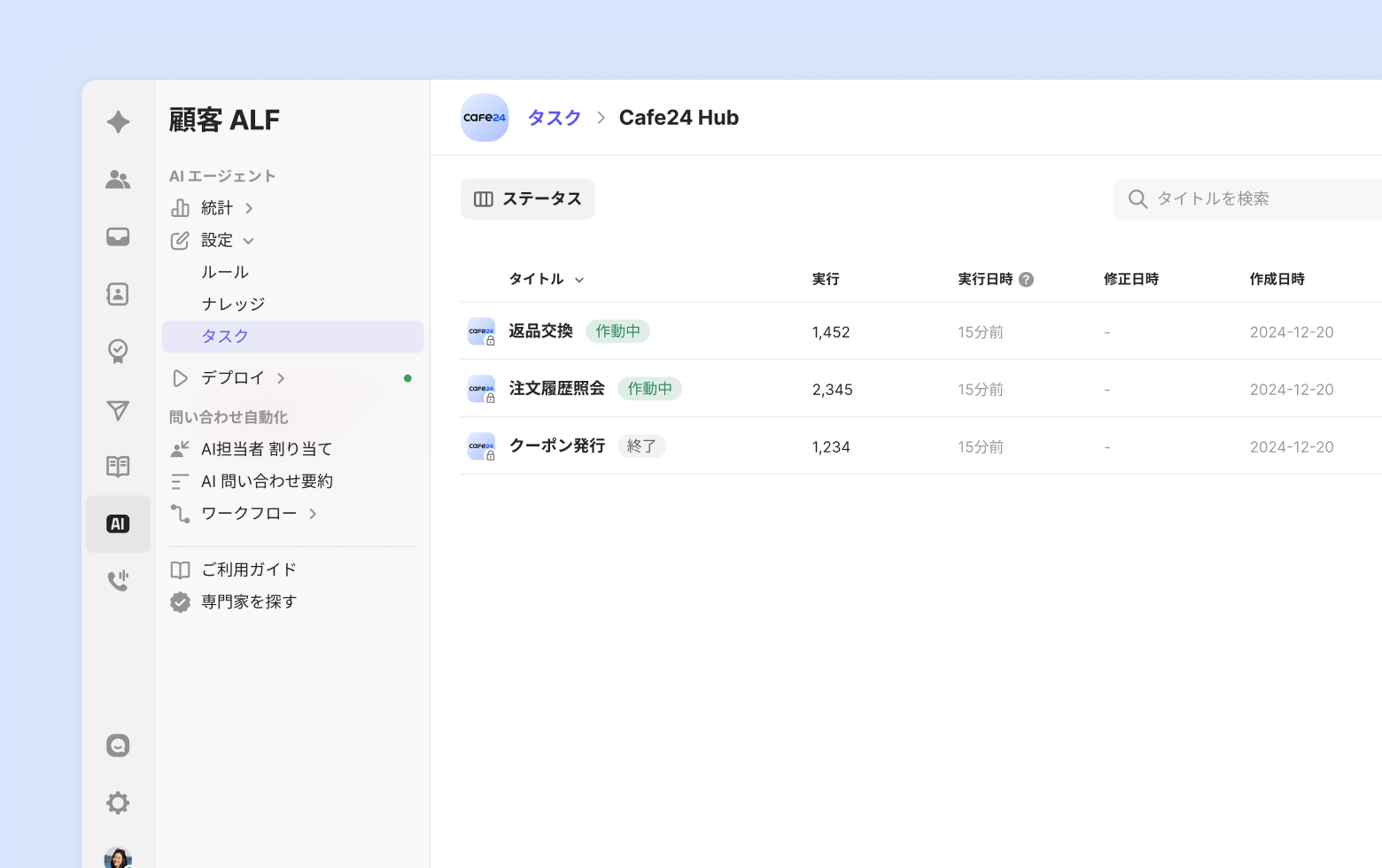 Cafe24 Hubアプリを設定すると、Cafe24専用タスクを利用できます。問い合わせ対応中に顧客が [注文照会] [注文キャンセル] を要請すると、ALFがタスクを自動的に実行し、会話形式で業務を処理します。(→ タスクを見る)