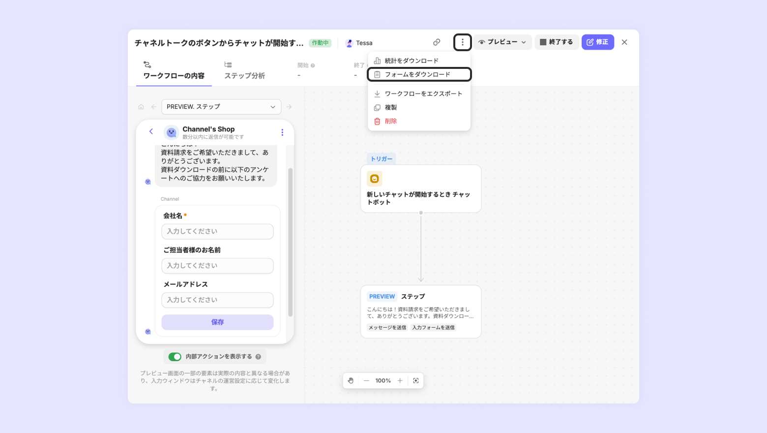 顧客にフォームを送信後、入力された情報をまとめてダウンロードすることができます。フォームのダウンロードは実行されたワークフローでダウンロードできます。