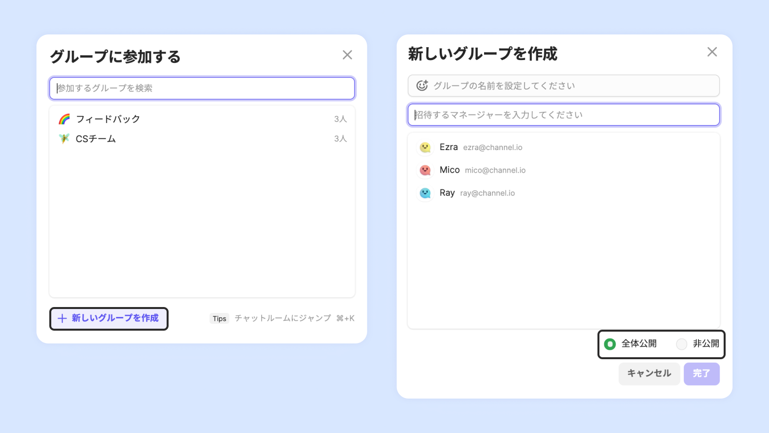 方法:[社内チャット] - [公開グループ] - [+ボタン] - [新しいグループを作成]