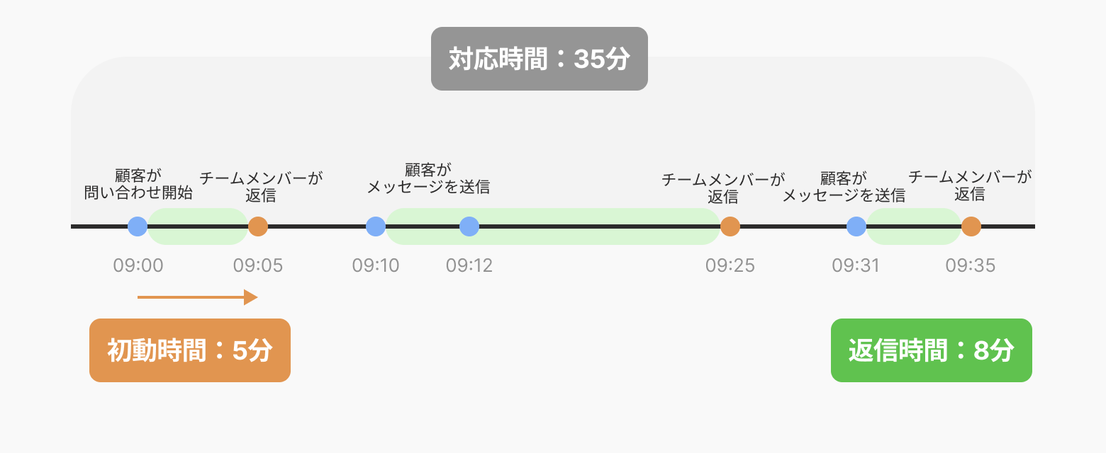 09:22 顧客が最初のメッセージを送った, 09:25 再度顧客がメッセージを送った09:30 チームメンバーが返信をした → 初動時間は 8分