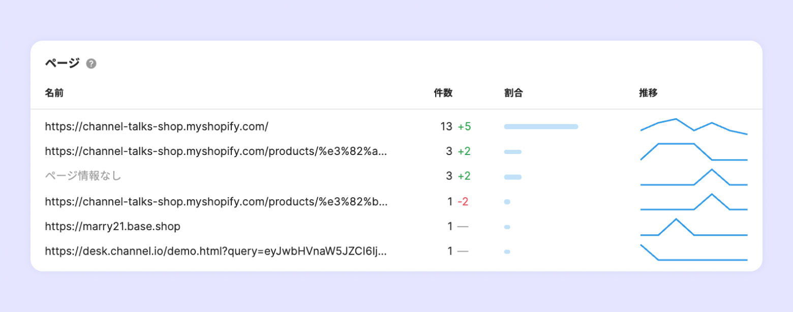 設定した期間内に、ウェブやアプリのどのページからチャットボタンを押してチャットに流入してきたのかを確認することができます。既に一度対応しているチャットルームで再度メッセージを送った場合は、最初に流入してきたページの情報が表示されます。