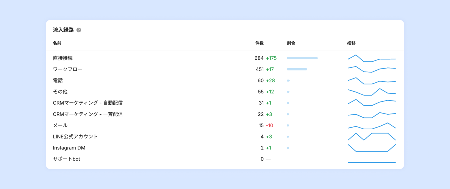設定した期間内に、どのような経路でチャットに流入してきたのかを表示します。 既に一度対応しているチャットルームで再度メッセージを送った場合は、最初の経路情報がそのまま表示されます。