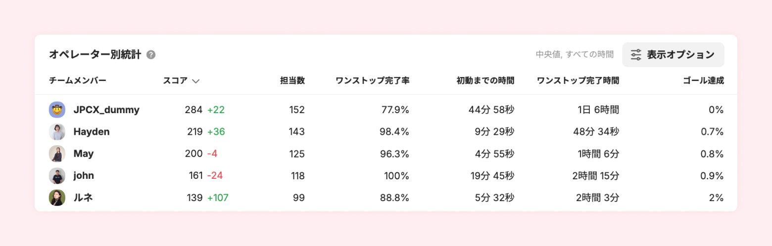 担当数によってスコアが高くなる訳ではありません。 どのぐらい素早く最初から最後まで担当し、多くのチャットに対応したのかを、総合的に把握してスコアに変換されます。参加したチャットが多いほど、そして初動時間が短くワンストップ完了率が高いほど、スコアが高くなります。