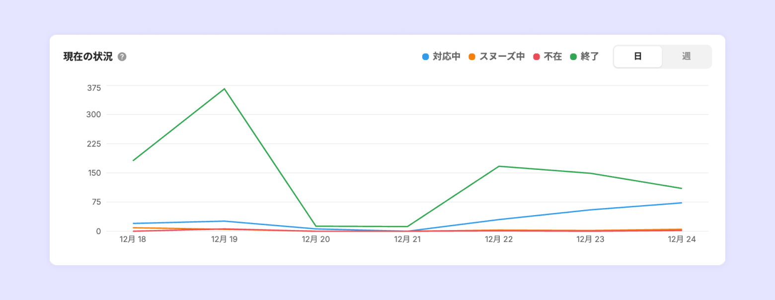 昨日までのすべてのチャットが1件も残らずに終了した状態で、今日はまだ1件も新しいチャットが流入していないという場合にこのグラフを見ると、対応中とスヌーズ中のグラフが0になっています。