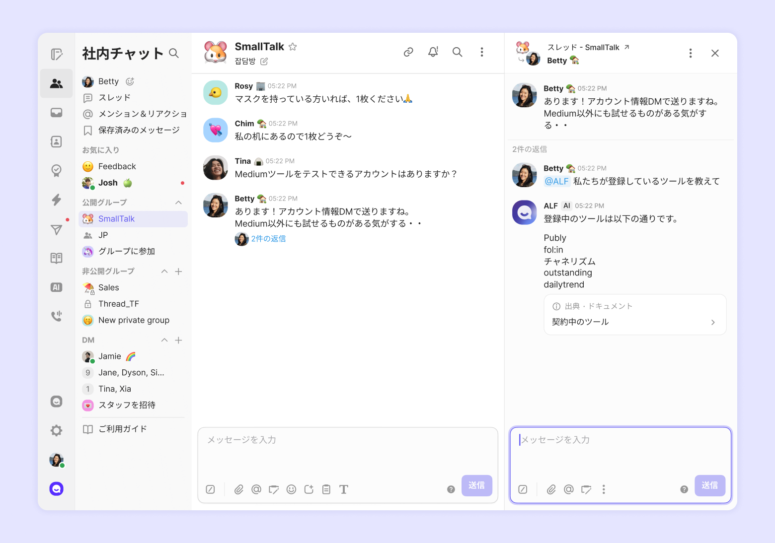 社内ALFは、社内チャットまたは接客チャットで呼び出して、必要なコンテンツを素早く探し、適切な共感表現をおすすめし、顧客対応の内容を簡単に要約してくれます。