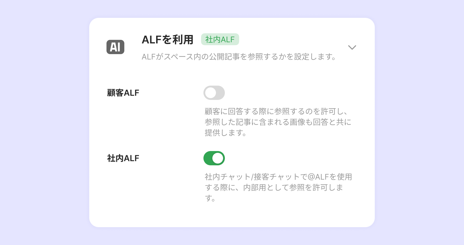 社内ALF:チームメンバーが社内ALFを呼んだ際に公開されたFAQと記事を参照するかを設定します。