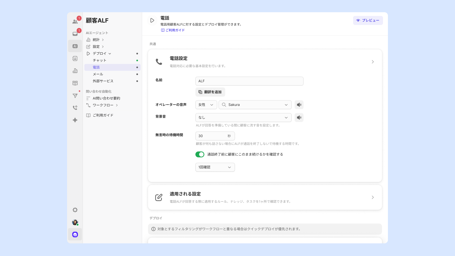 場所:[AIメニュー] - [顧客ALF] - [設定] - [デプロイ] -[電話] でALF接続時に最初に流れる挨拶を設定できます。
