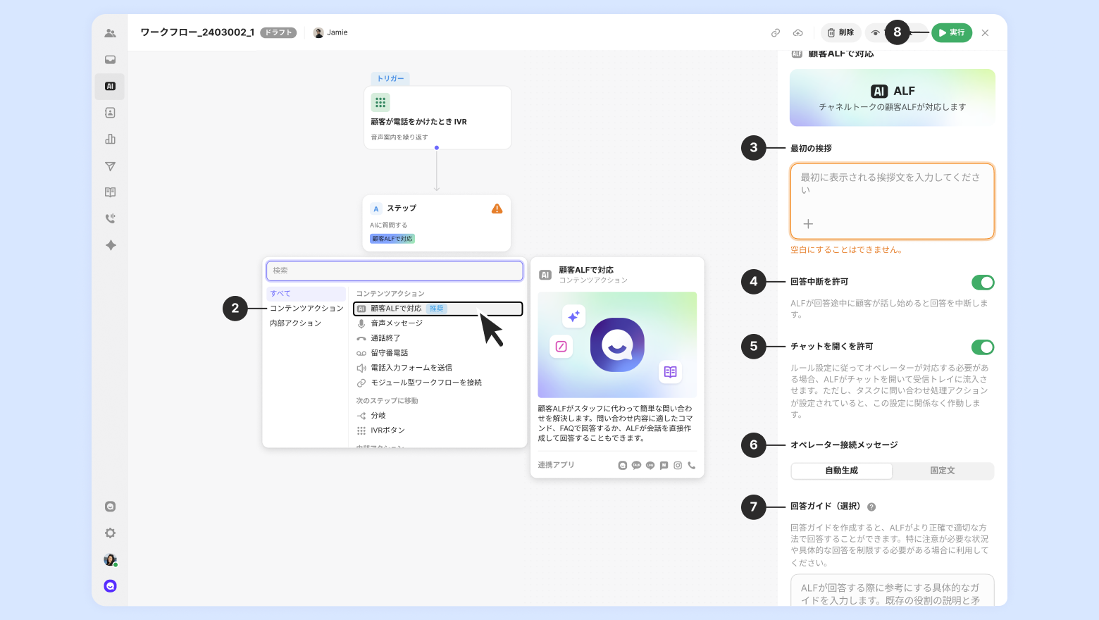 IVRワークフローを設定し、音声ボタンや音声メッセージなどのアクションを構築し、希望するステップで電話ALFアクションを追加する方式です。[AIメニュー] - [顧客ALF] - [設定] - [デプロイ] - [ワークフロー] で電話ALFアクションが設定されている作動中ステータスのワークフローを確認できます。