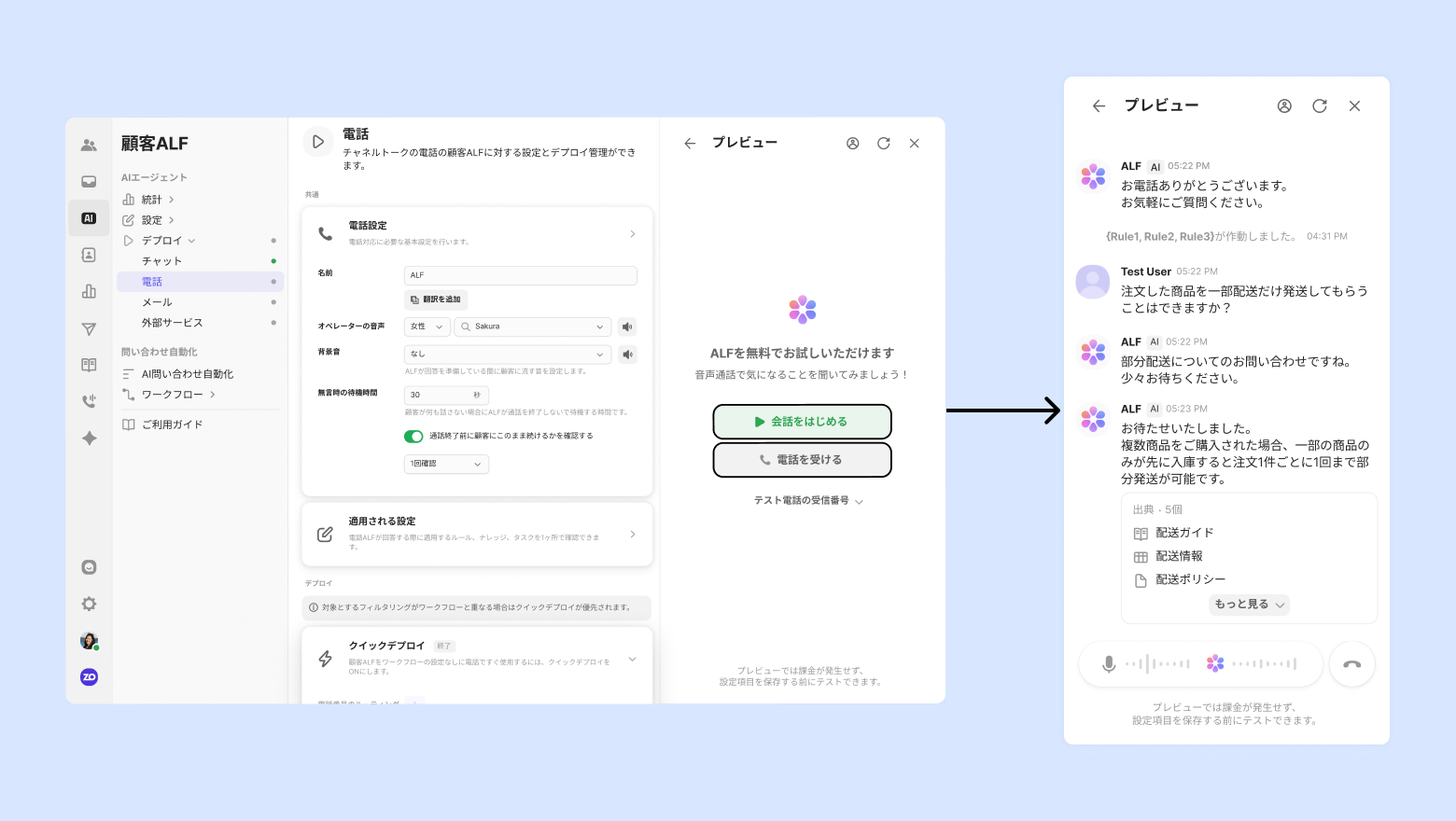 既存の顧客ALFを電話でも使えるように拡張した機能です。顧客が電話で問い合わせをすると、ALFがまず電話対応をし、必要に応じてオペレーターに接続します。