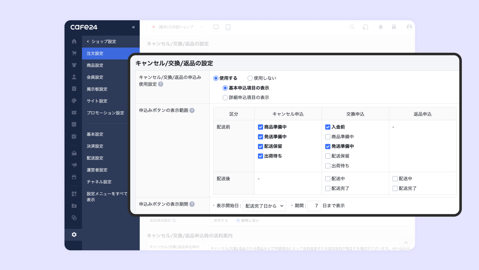 返品/交換コマンドは、Cafe24の [ショップ設定] - [注文設定] - [注文設定(注文後)] にある「キャンセル/交換/返品の申込み使用設定」に合わせて作動します。この設定が「使用しない」になっている場合、返品/交換コマンドを実行しても「返品/交換できる商品がない」というメッセージが表示されます。