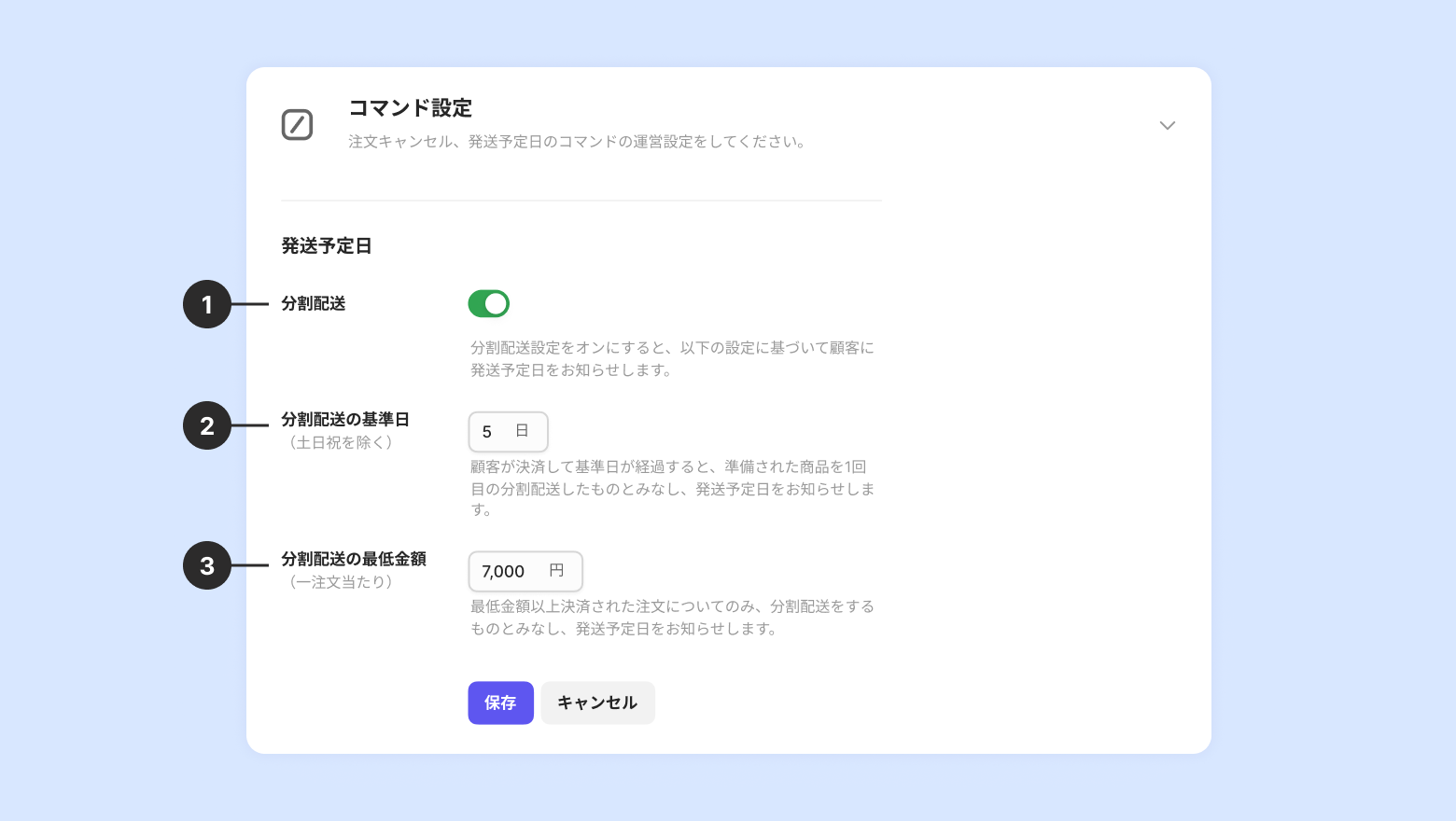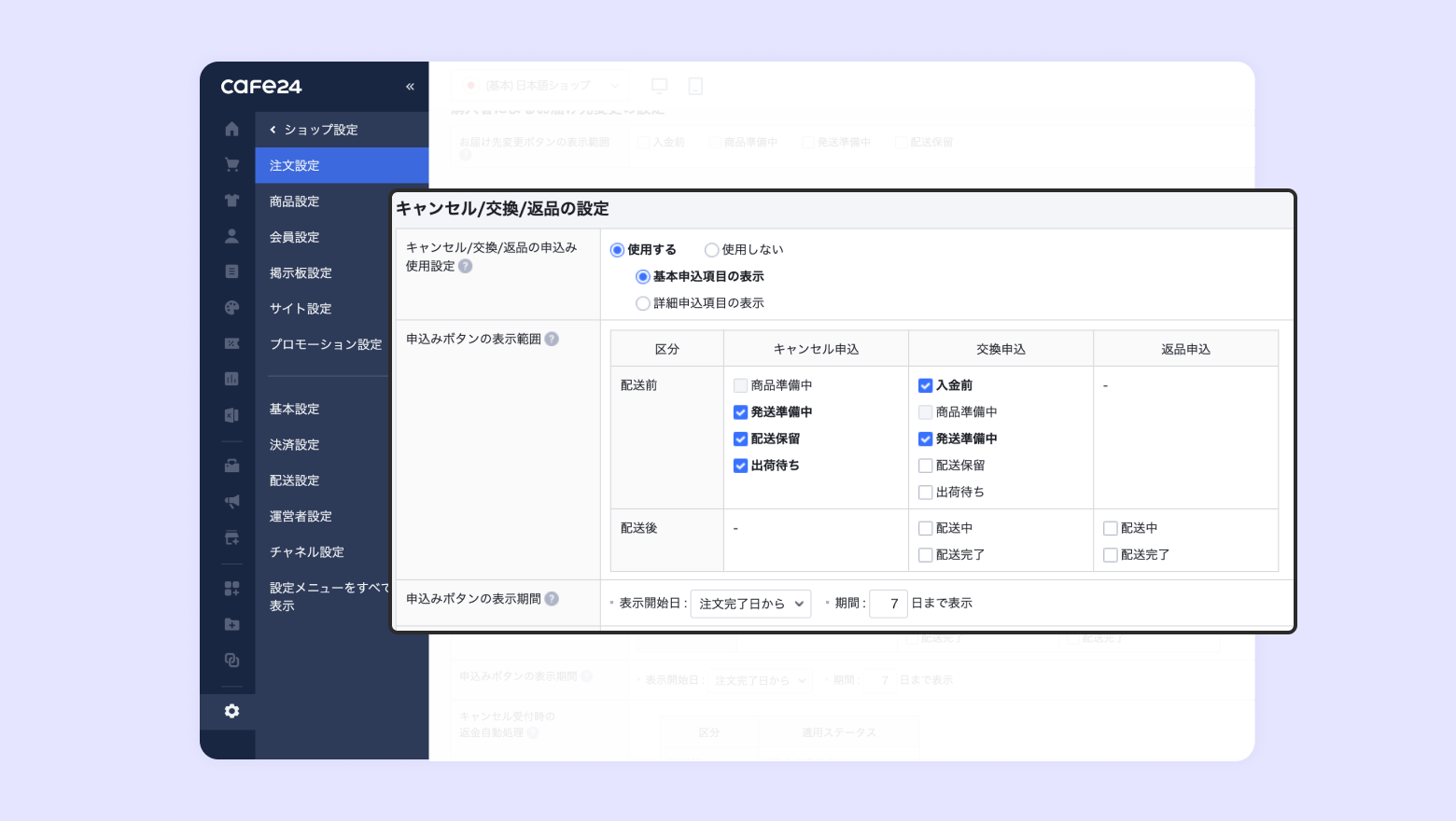 • 表示期間設定が「注文完了日基準」 の場合、設定した期間を過ぎるとキャンセル可能リストに表示されません。(例:注文完了日基準で「7日まで表示」と設定している場合、配送準備中であっても 注文から8日以上経過した注文はキャンセル可能リストに表示されません。)