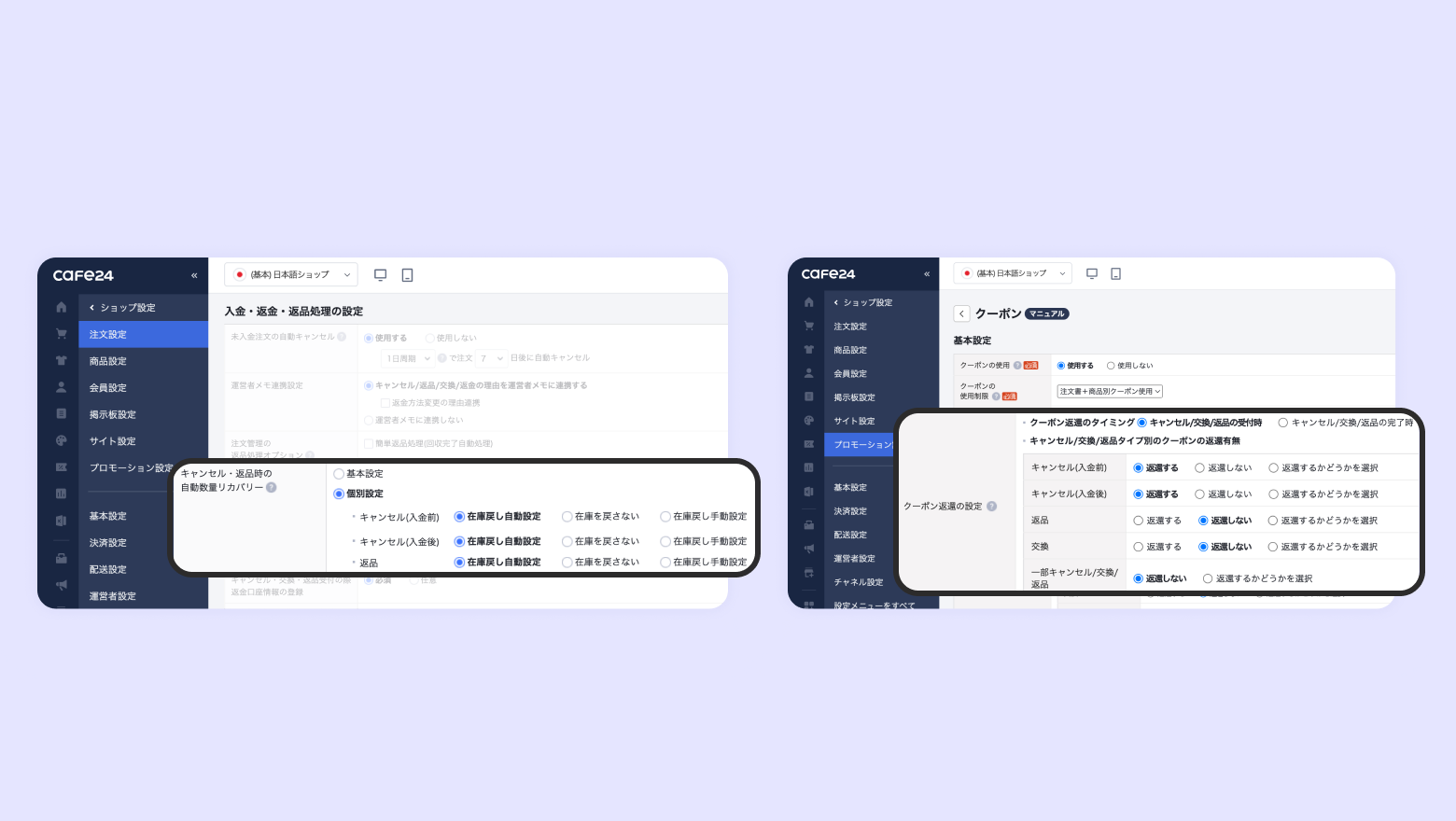 • Cafe24アドミン上の場所:[ショップ設定] - [プロモーション設定] - [特典設定] - [クーポン] 基本設定内の「クーポン返還の設定」